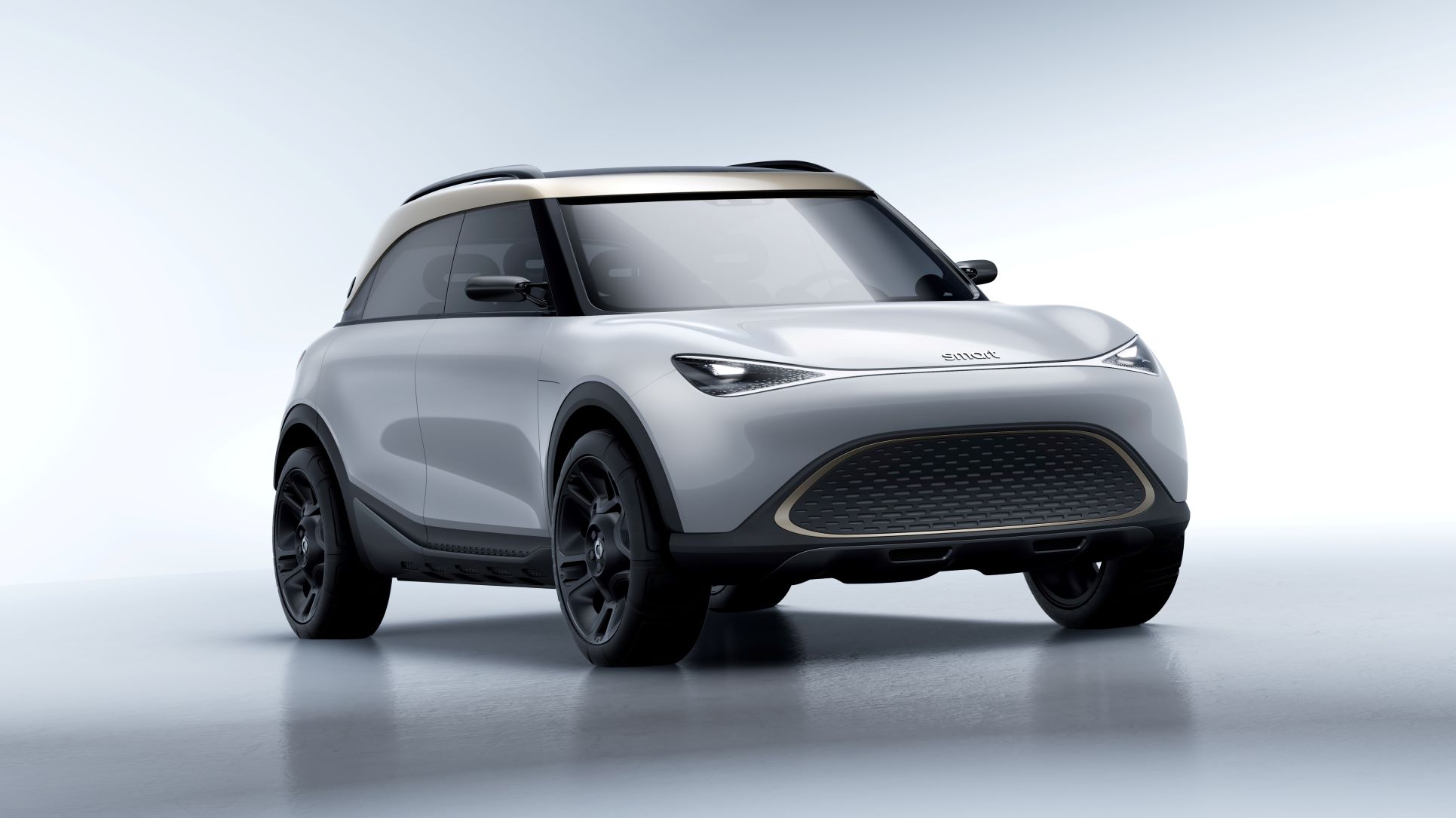 The car has the usual-for-Smart short overhangs at the front and rear, but most other things have changed. One of the central design features of the concept is the large panoramic glass roof. Another is the smooth transition from the windshield, to the window surfaces of the frameless doors, to the rear glass—all meant to make the roof appear to float above the body. Contrasting design elements in anthracite and black in the lower body area emphasize SUV robustness, accentuated by large 21-in wheels.