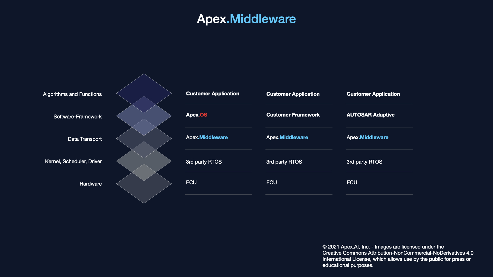 The software is designed to be used with any other development framework including AUTOSAR Adaptive. Apex.Middleware was developed as a highly optimized integration of the Eclipse Foundation’s DDS and Iceoryx.