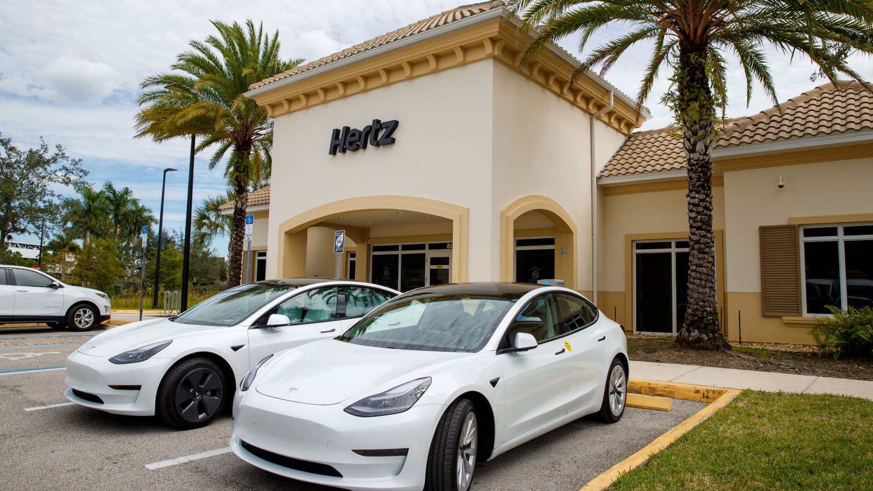- Tesla Model 3 electric vehicles at a Hertz neighborhood location.
