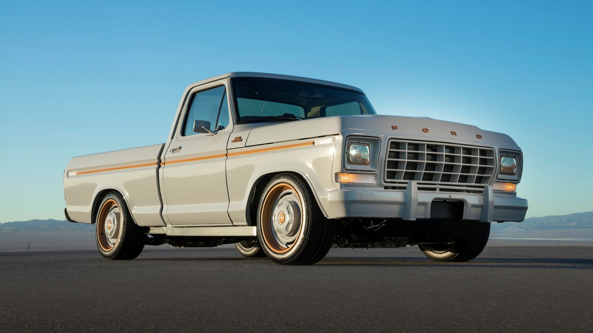 The concept truck designed and created by Ford Performance was built in collaboration with MLe Racecars and sits on a custom chassis by the Roadster Shop. The Avalanche Gray truck has Cerakote Copper accents applied by Brand X Customs. Custom billet aluminum three-piece wheels in a definitely not vintage side of 19 x 10 in are by Forgeline and are wrapped in Michelin 275/45-19 high-performance tires. The interior features a billet aluminum dash by JJR Fabrication and avocado-tanned leather upholstery by MDM Upholstery.