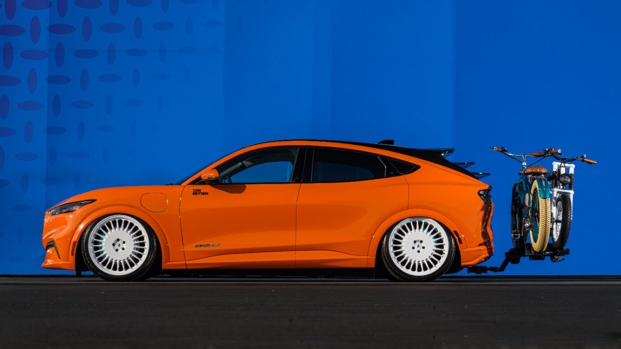 The Tjin Edition Mustang Mach-E California Route One was created by Neil Tjin with a distinctive California style. It has bright orange custom paint with teal green accents and custom LED headlights from LightWurkz. Solar panels on top and down the back are designed to power a custom teal green RayVolt USA electric bicycle mounted to a Thule e-bike rack. Underneath is an air suspension from Hoppo’s Suspension with Baer 6S six-piston front and rear big brake kit, plus ultra-wide Falken Ziex S/TZ05 tires mounted to custom-painted 22-in Vossen ML-R1 wheels. Inside are Recaro seats with white leather surfaces, with teal lighting and teal seatbelts by Seatbelt Planet, plus accessories from Razor. Inside the frunk, the air suspension system has a clear acrylic tank with LED lighting and cooling fans.