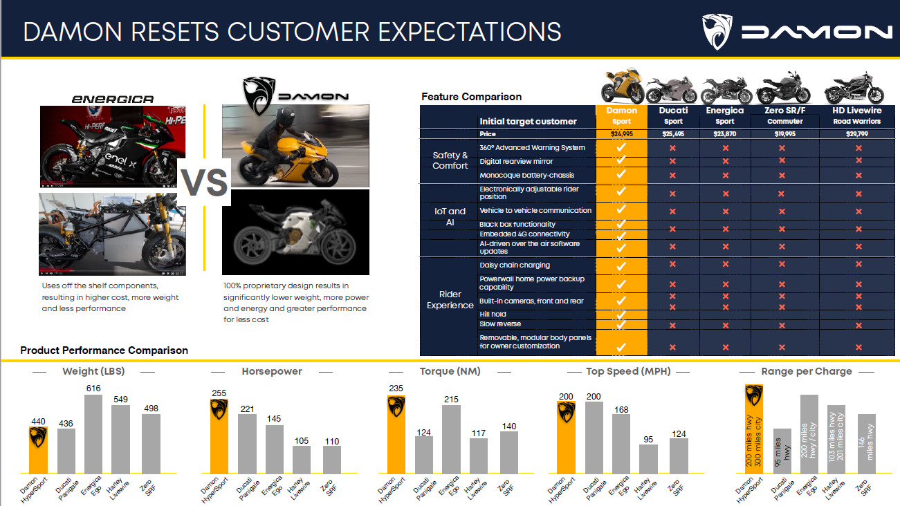 The company’s first motorcycle, the HyperDrive-based HyperSport, features a 100% proprietary design that results in significantly lower weight than other electric motorcycles, but with more power and energy, and greater performance for less cost than the competition. In Damon’s presentation materials, the company compares its HyperSport with a competitive set of the Ducati Panigale, Energica Ego, Harley Livewire, and Zero SRF.