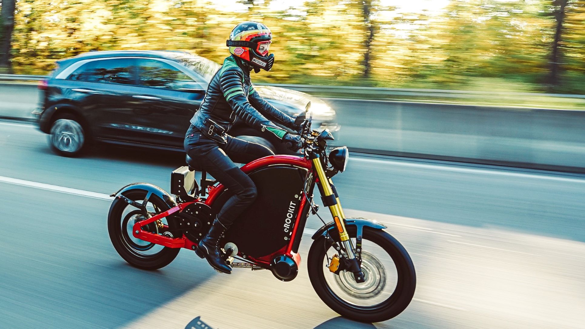 - eROCKIT’s electric motorcycle on the road. (Sven Wedemeyer/eROCKIT)