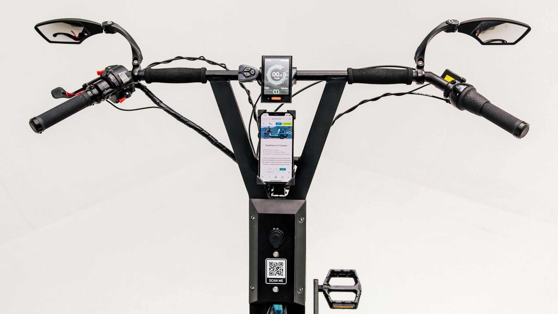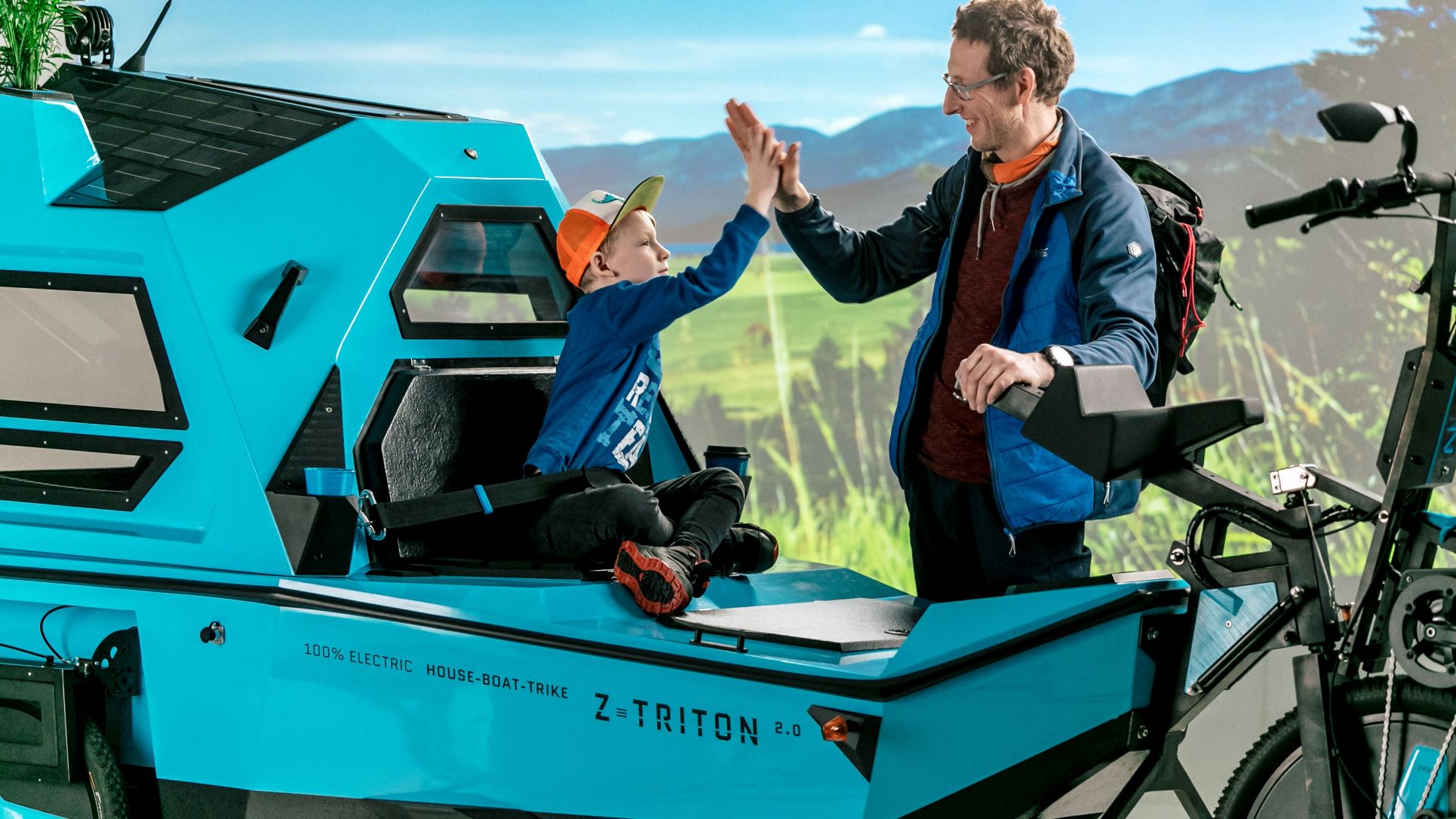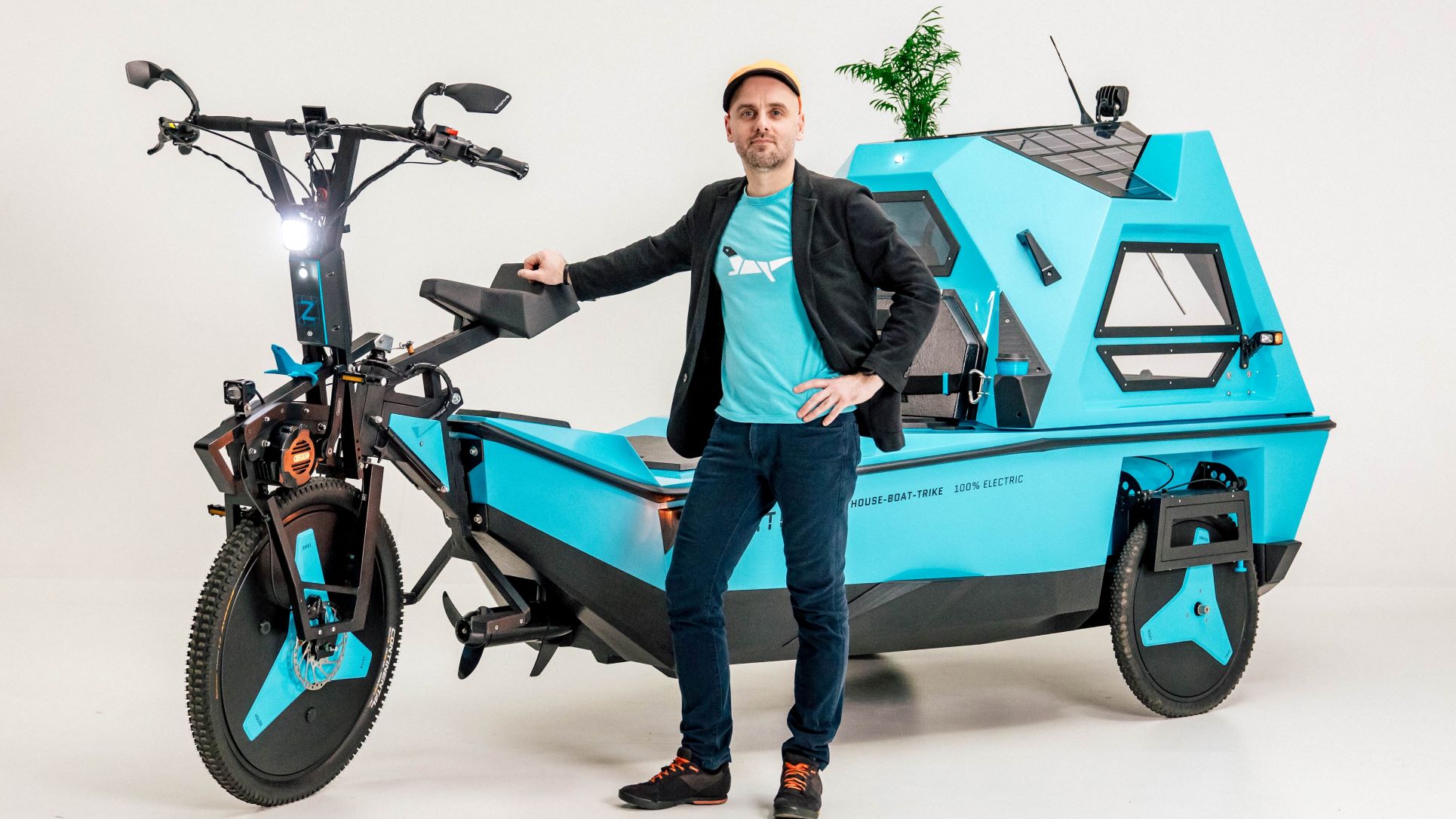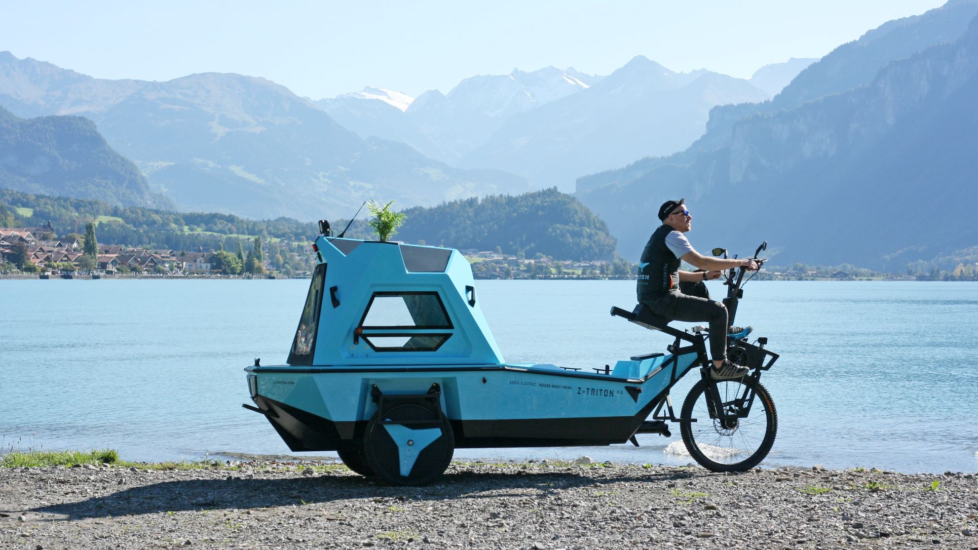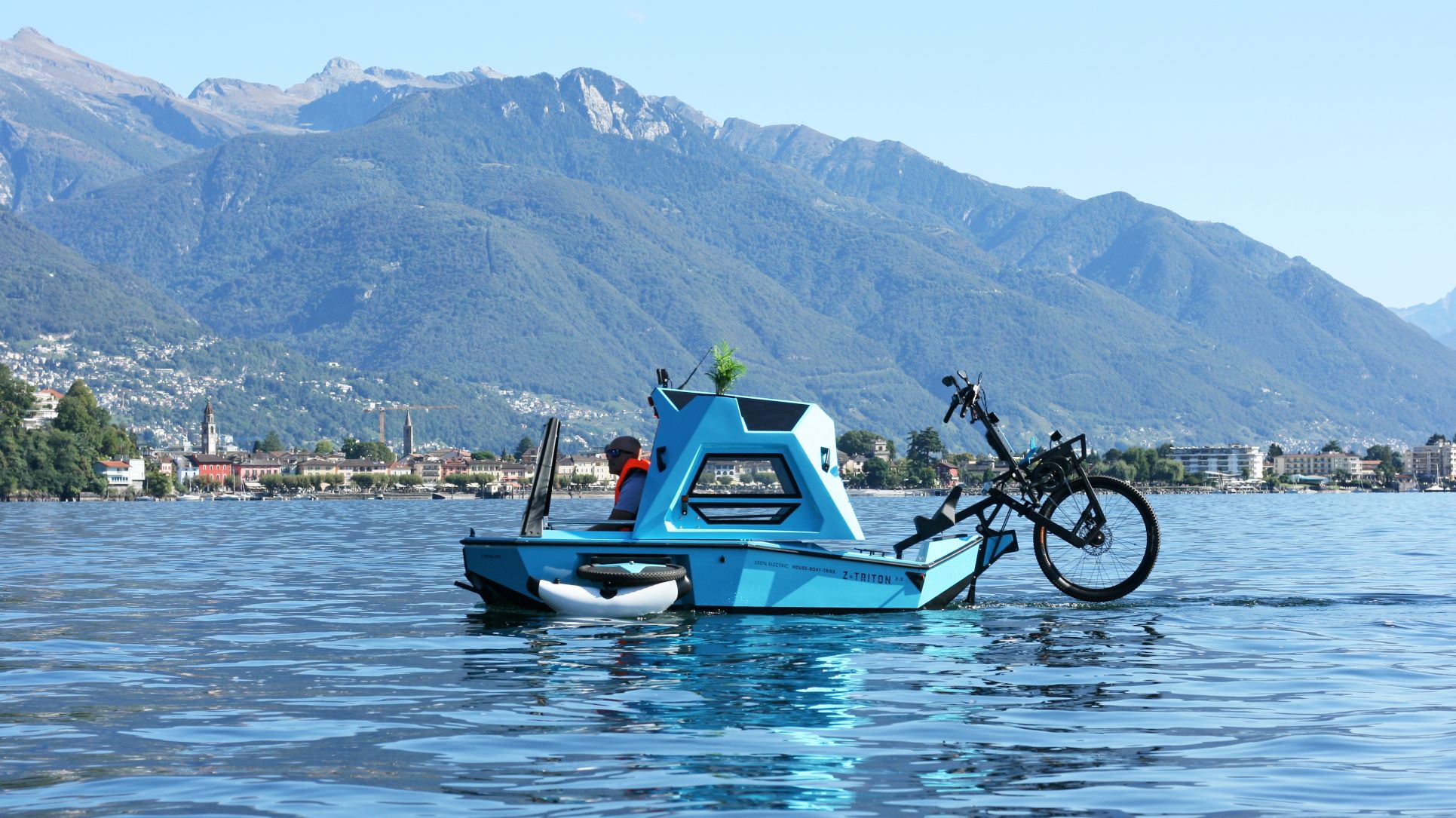 The product is 100% electric with both boat and trike electric-assist motors, a Li-ion battery pack, and integrated roof solar panels. The range is “two days,” or 50 km (31 mi) on land and 20 km (12 mi) on water.