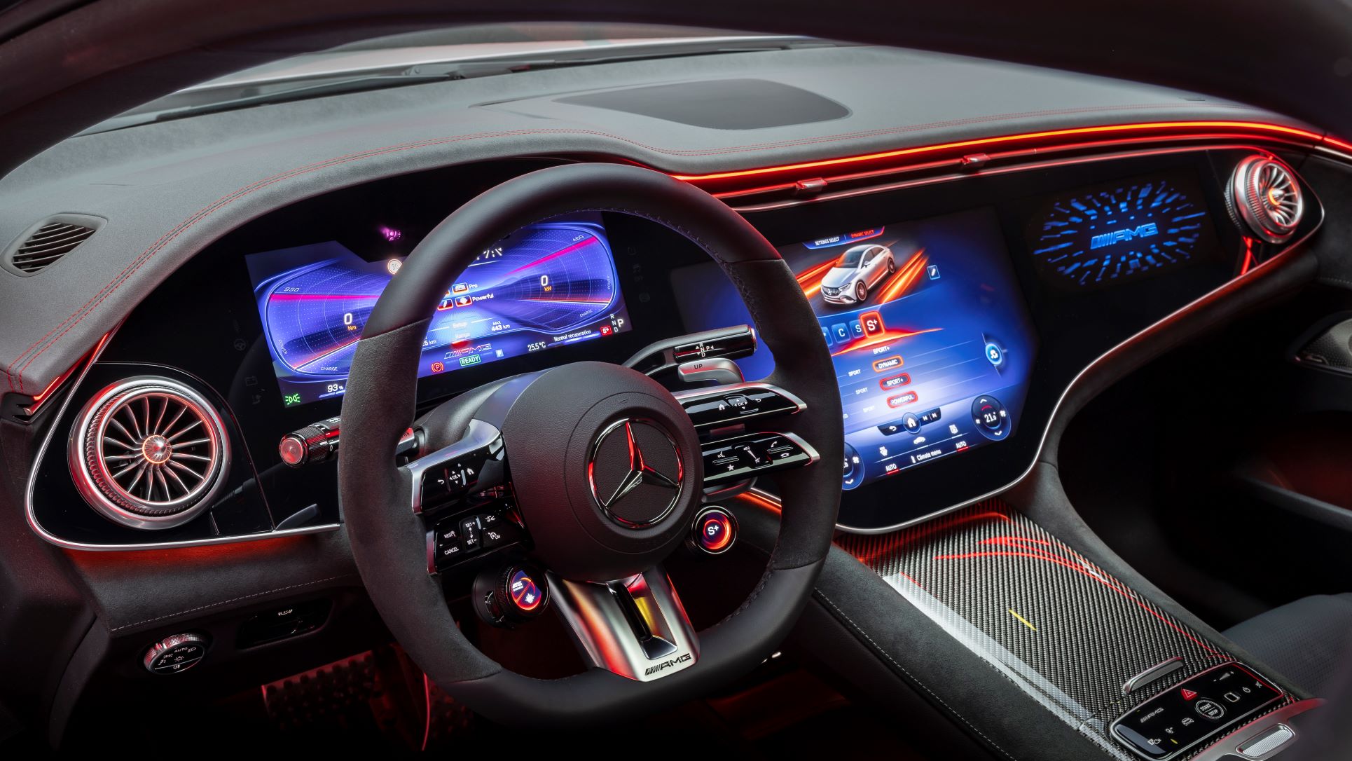 Inside are AMG-specific seats, instrument panel and beltline trim, door center panels, steering wheel, pedals, floor mats, and door sill trim. The optional Hyperscreen for the MBUX infotainment system offers a range of additional AMG functions that emphasize performance.