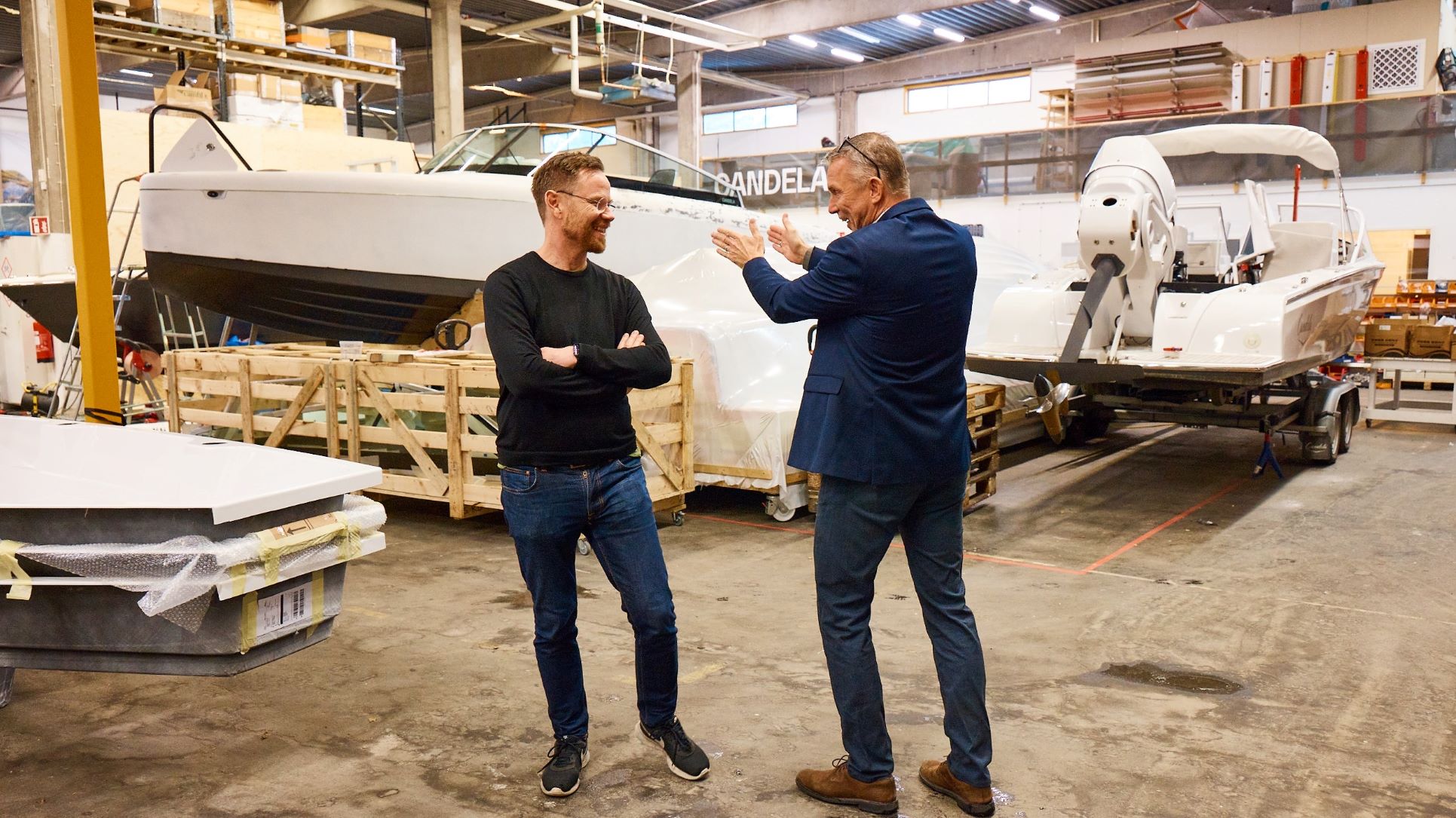 - Candela CEO Gustav Hasselskog and Agapi CEO Peder Asplund on the Candela factory floor.