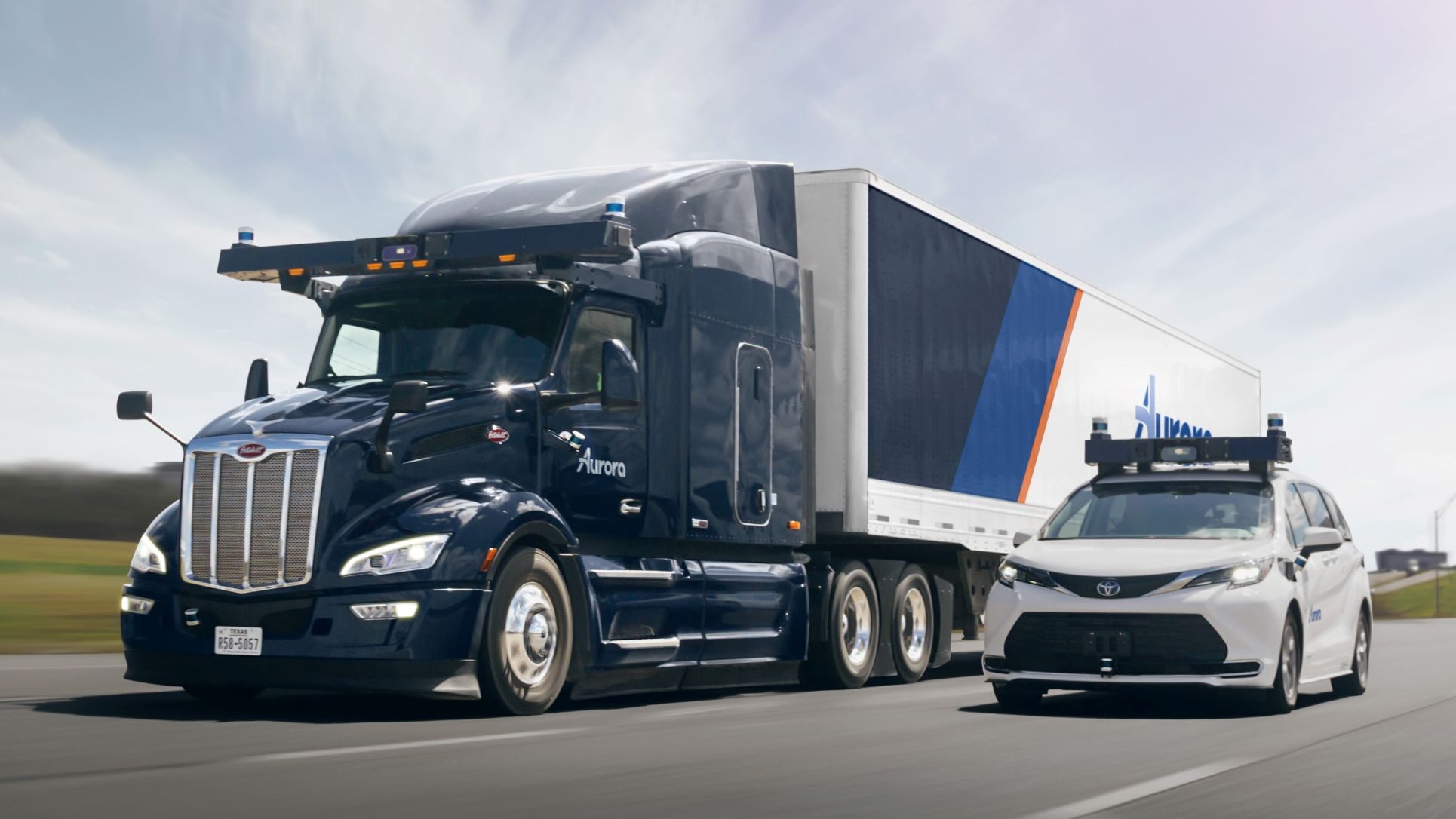 - Aurora’s Peterbilt truck and Toyota ride-hailing vehicles on the highway.
