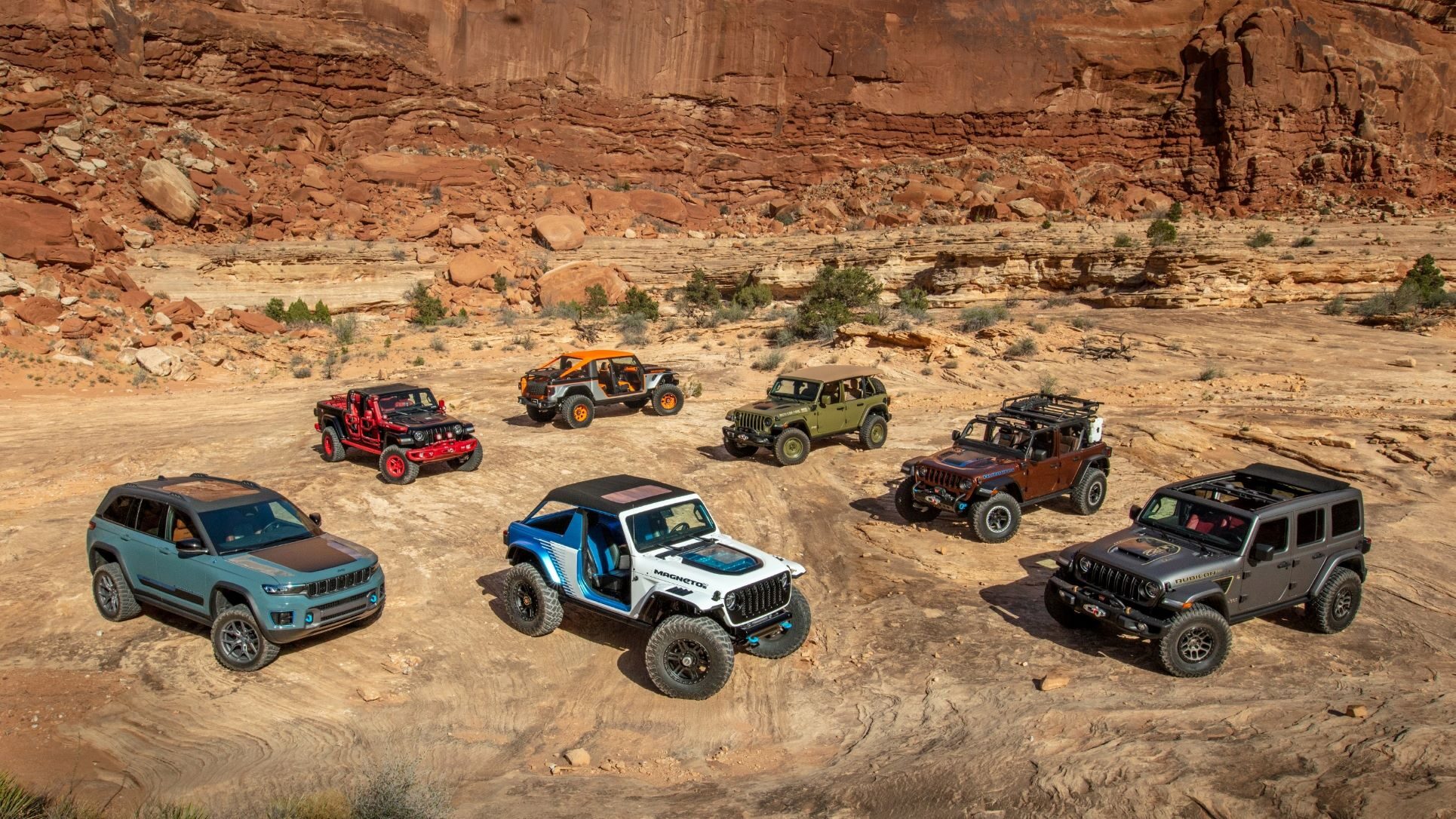 This year’s custom Jeep 10-vehicle Moab lineup has an array of advanced powertrains headlined by the return of the Wrangler Magneto, the first battery-electric vehicle (BEV) concept from the brand. The new, more capable version 2.0 concept and four other 4xe PHEV (plug-in hybrid electric vehicle) concept vehicles are meant to reinforce the Jeep brand’s commitment to “Zero Emission Freedom,” while also featuring the latest production and prototype JPP (Jeep Performance Parts) from Mopar goodies.