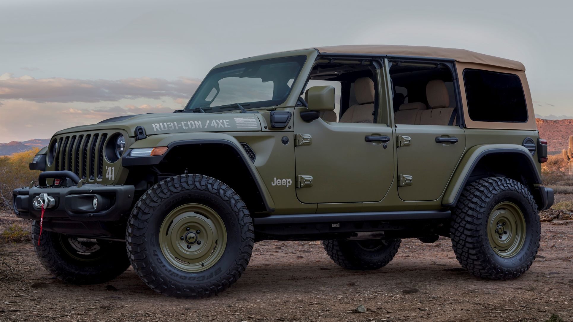 The ’41 concept pays homage to Jeep vehicles of the past, specifically the original Willys MB for the U.S. Army in World War II. However, the retro Willys concept blends military influence with the Wrangler 4xe’s electric-vehicle technology. The concept’s 4xe plug-in hybrid powertrain is capable of an estimated 49 MPGe and delivers up to 21 mi (34 km) of zero-emission, electric-only propulsion.