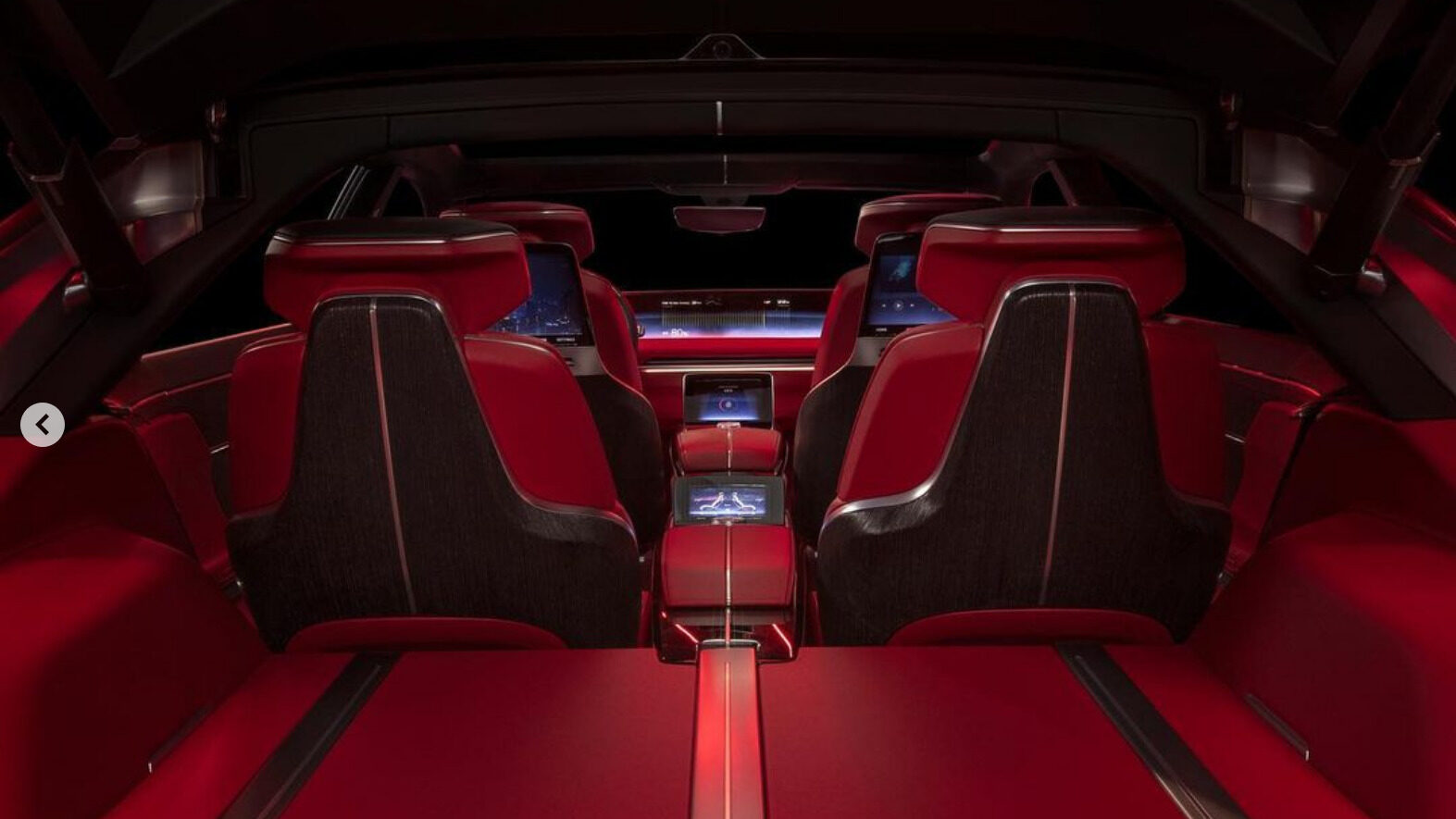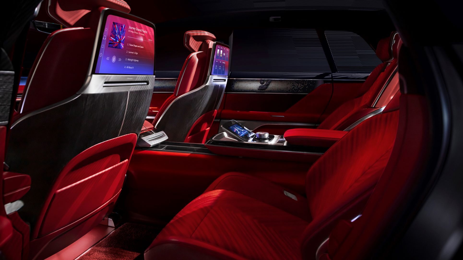 The main 55-in LED display introduces a passenger display with “electronic digital blinds” active privacy technology designed to allow passengers to enjoy video content while not distracting the driver. The Smart Glass Roof features SPD (suspended particle device) technology that allows for four zones of variable lighting, enabling passengers to fine-tune their cabin experience for completely personalized comfort and visibility.