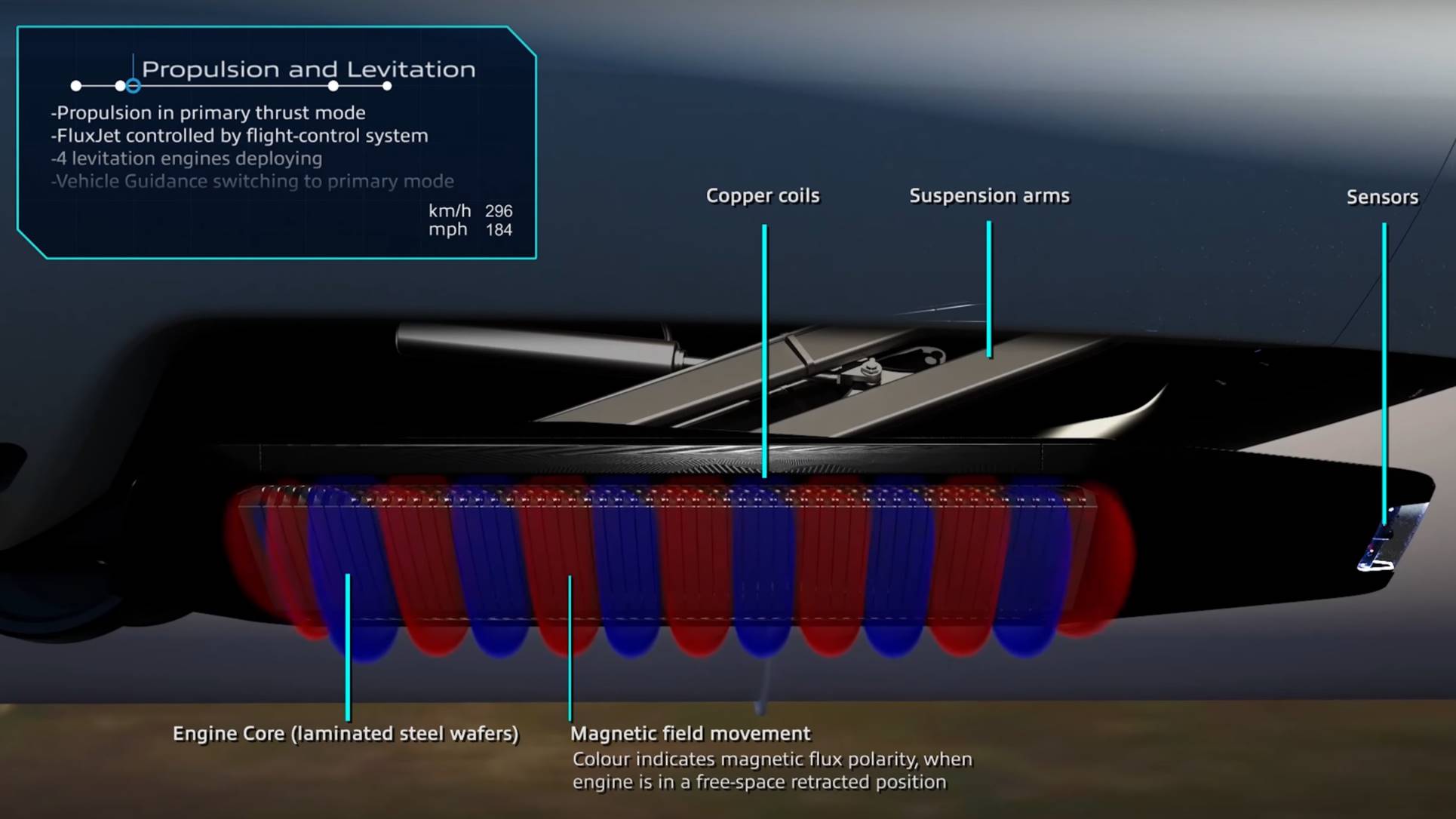 The FluxJet travels between urban stations at atmospheric pressure on low-speed FluxWay guideway sections.