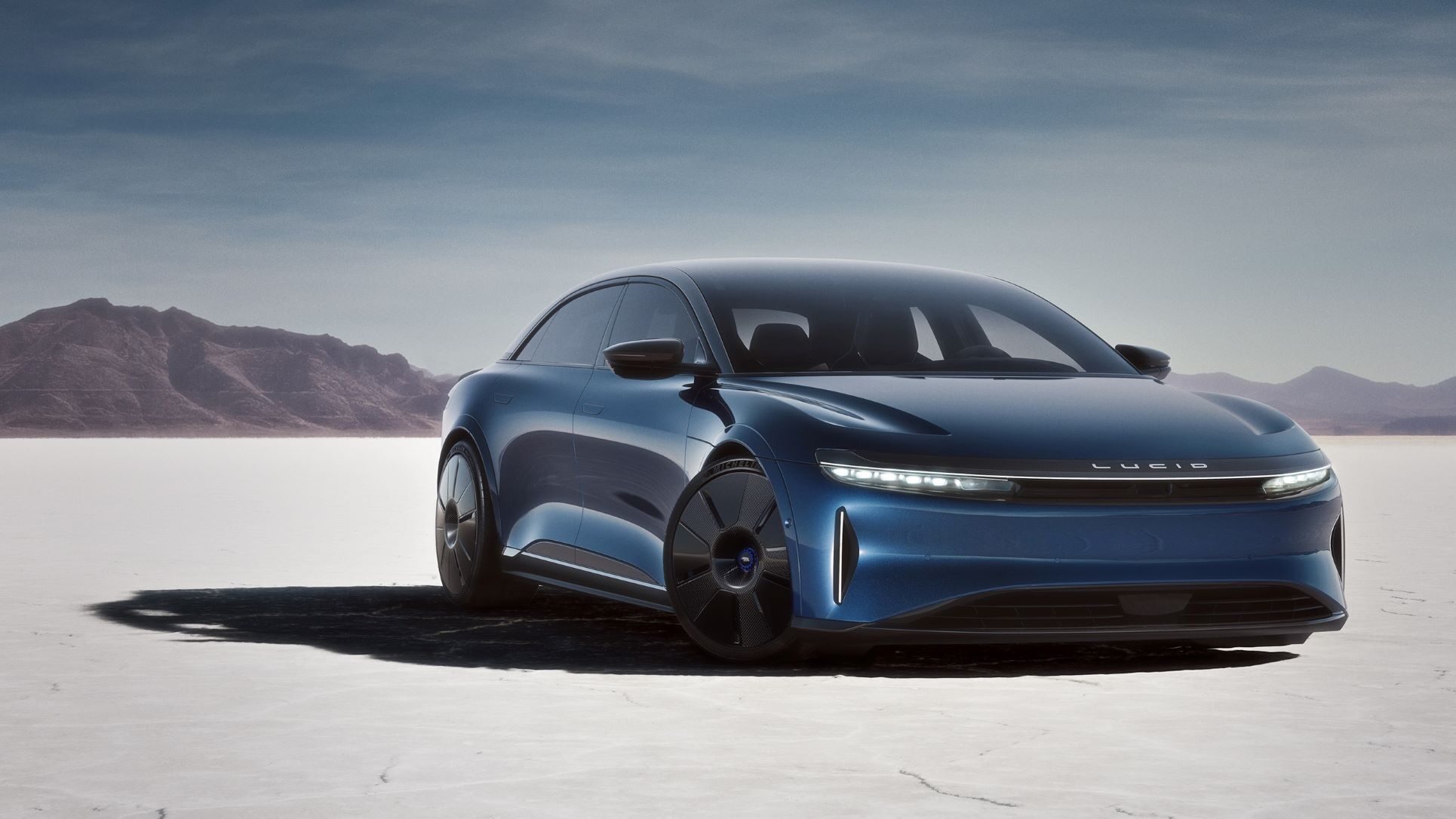 - Lucid Air Sapphire with carbon-fiber disc wheel covers.