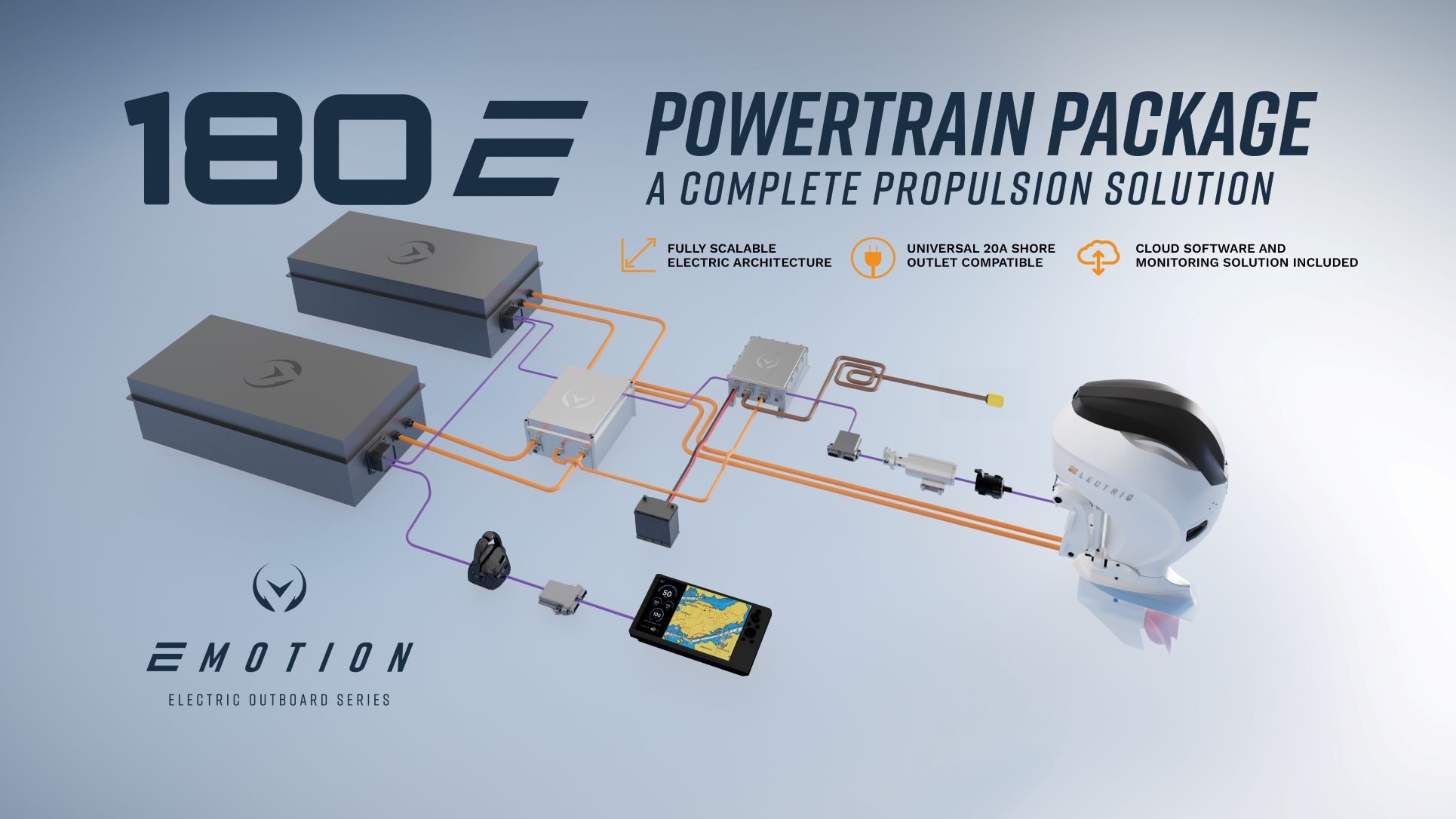 The company says its flagship E-Motion outboard powertrain is the first fully electric purpose-built outboard powertrain system that combines an advanced battery pack, inverter, and high-efficiency motor with proprietary union assembly between the transmission and electric motor design using extensive control software. The powertrain systems engineering is said to improve the efficiency of the outboard powertrain, enhancing both range and performance.
