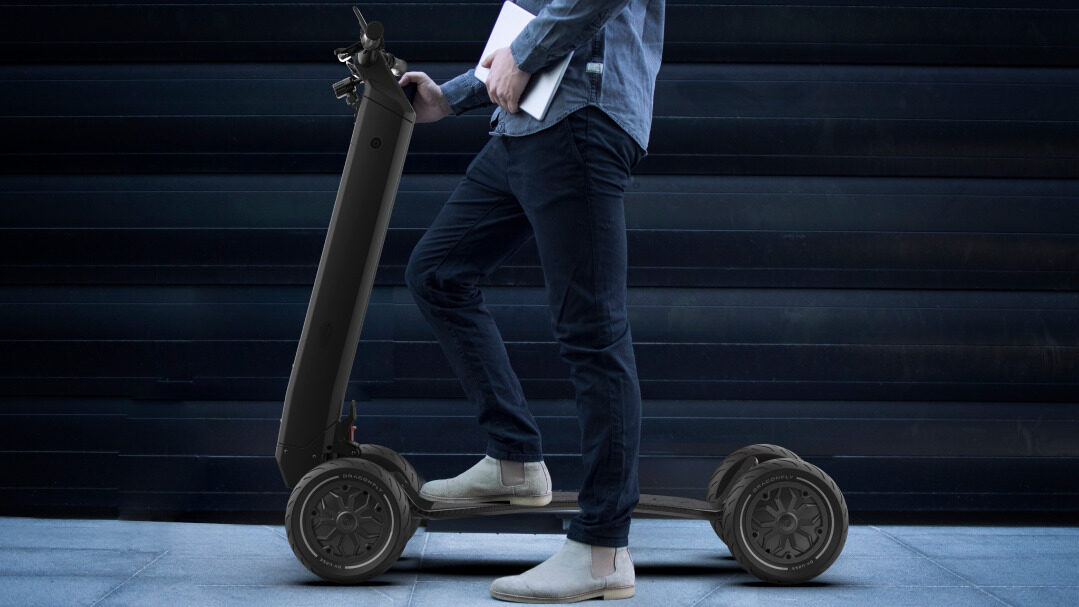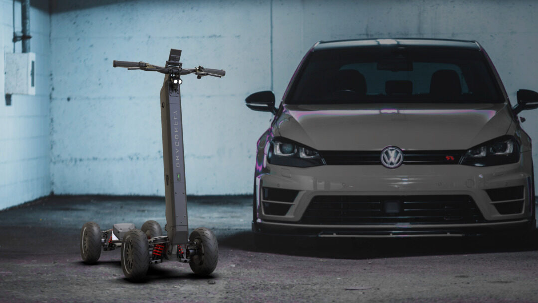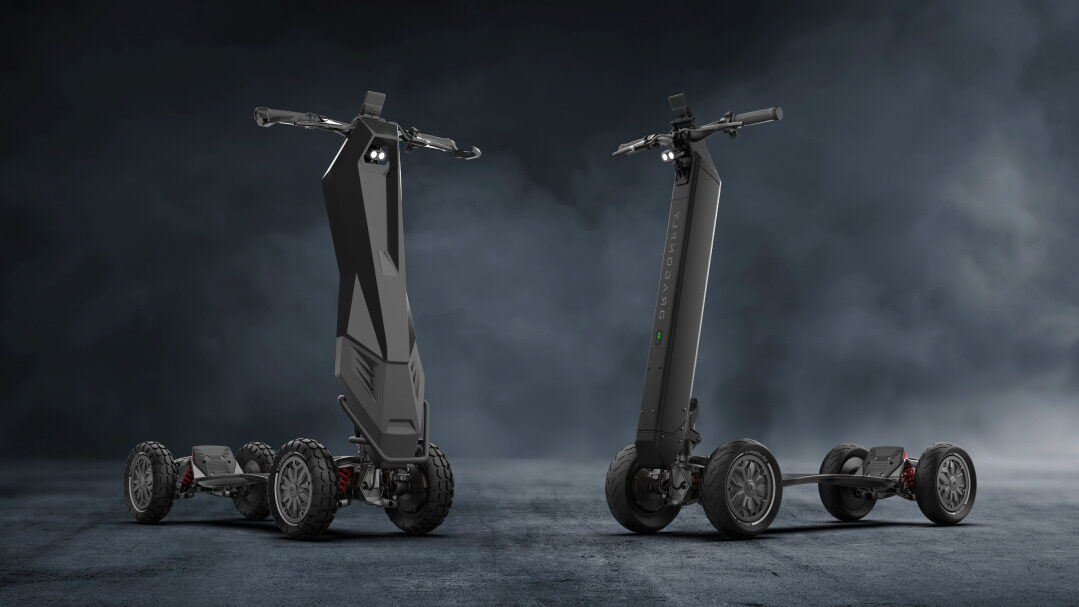 The company pitches the four-wheel electric hyperscooter as the urban mobility equivalent of a supercar with 10-in slick tires and meticulously engineered components. It has a wide carbon-fiber platform to offer stability and safety.