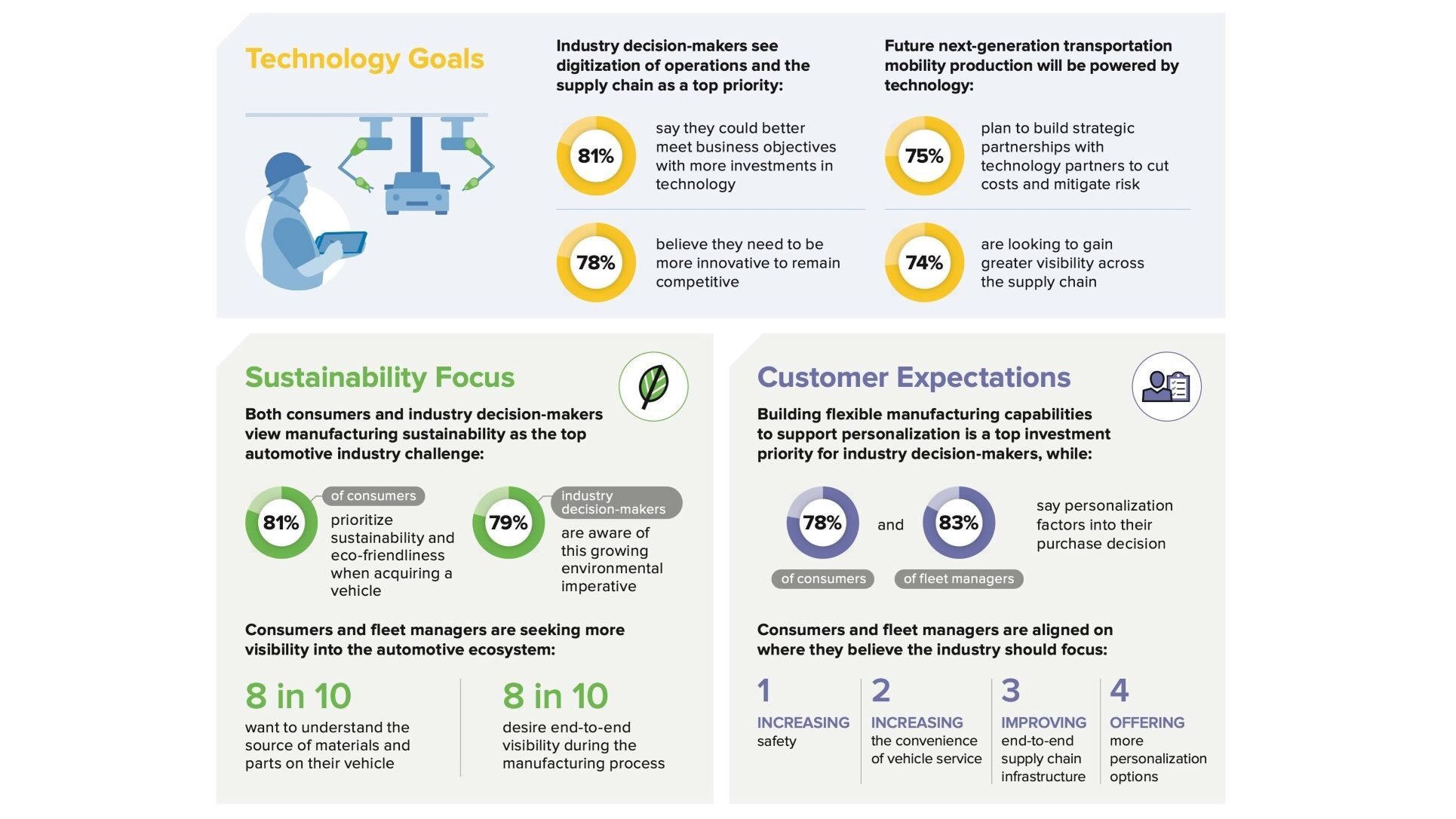 Consumers are also driving the growing emphasis on customizing vehicles. Nearly four-in-five consumers say personalization options factor into their decision to purchase a vehicle, and eight-in-10 fleet managers share these same requirements for sustainability and personalization. While nearly 80% of automotive industry decision-makers recognize consumers expect more sustainable and personalized vehicle options today, seven-in-10 concede it’s difficult to keep up with increasing customization demands. As a result, three-fourths of automotive manufacturers say a top priority is to build strategic partnerships with tech companies for their next generation of production.