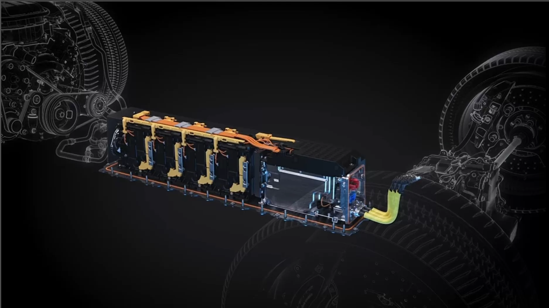The car’s V8 puts out 495 hp (369 kW) at 6450 rpm and 470 lb·ft (637 N·m) at 5150 rpm through an MLH eight-speed dual-clutch transmission to the rear axle. The permanent magnet electric motor over the front axle adds 160 hp (120 kW) and 125 lb·ft (165 N·m) to the front wheels through a single-speed gearset, the compact design preserving space in the front storage compartment. The 1.9-kW·h lithium-ion battery pack located between the seats is charged via regenerative energy from driving, coasting, and braking—with no plug-in charging.
