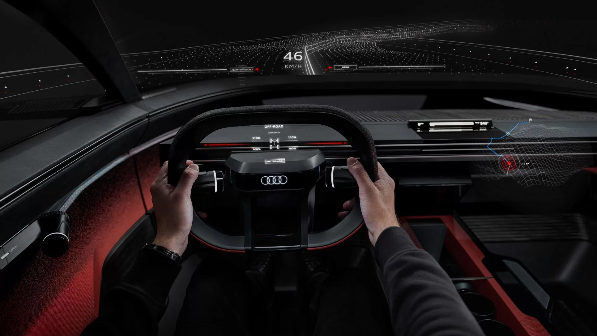 An autonomous chauffeuring capability available on “suitable terrain” to give drivers and passengers a new level of freedom, using the new display and operating technology in a variety of ways. The innovative operating concept, Audi Dimensions, combines the physical and virtual worlds by displaying mixed-reality digital content in the occupants’ fields of vision in real-time. High-tech headsets provide a view of the real environment and the route, while simultaneously displaying 3D content and interactive elements individually configurable for drivers and passengers.