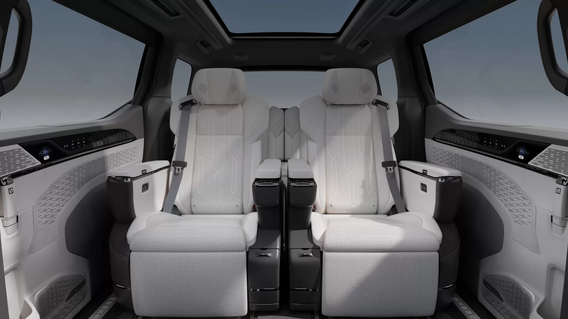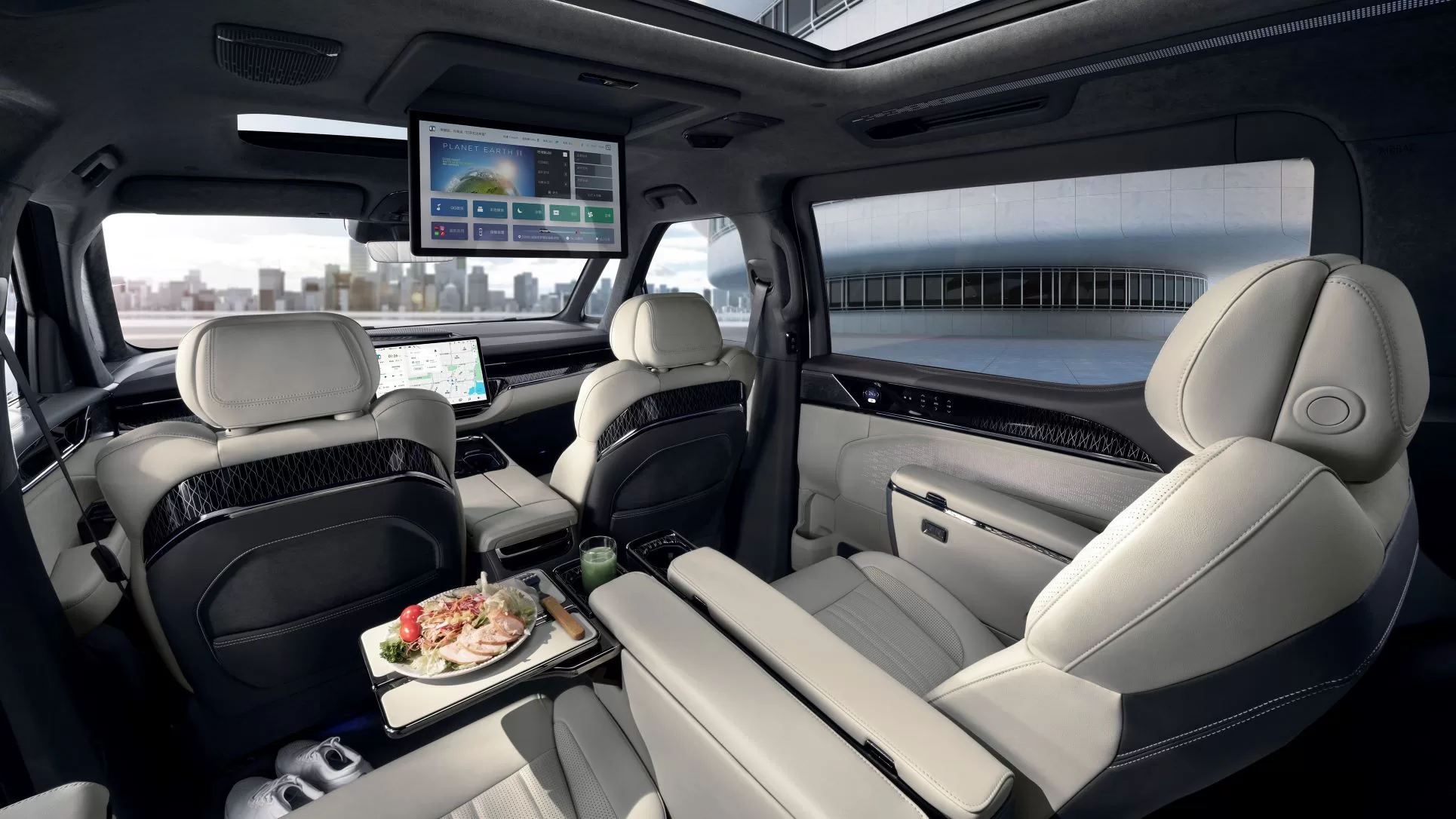 The MPV’s “best seats in the house” are Sofaro first-class aviation cabin seats in the rear rows. The soft Nappa leather seats have a generous 70-cm (27.6-in) width and cushion thickness of 12 cm (4.7 in). They are engineered to offer spa-class massage functions with multiple options. Adjustments are made with each seat’s smart armrests, and for added practicality, each seat comes with an adjustable 585-cm² (91-in²) deployable table.