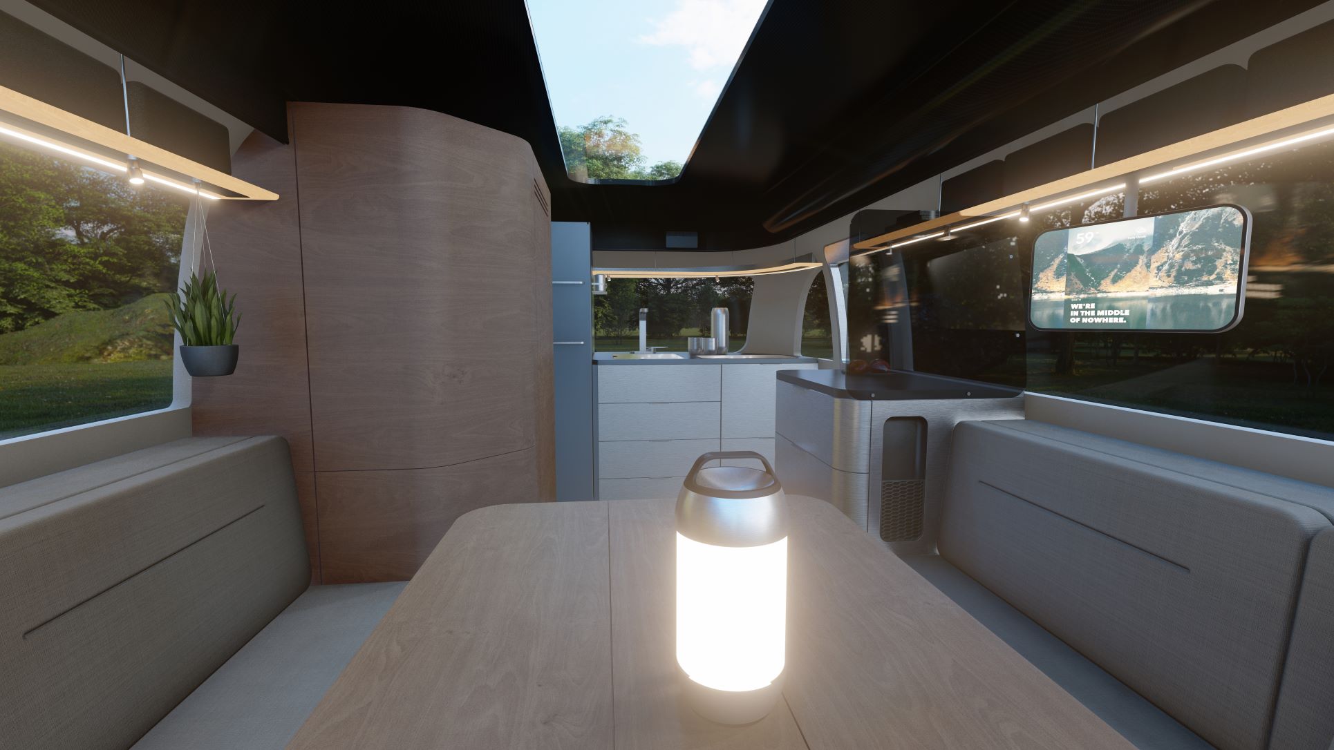 Several systems are tucked inside the 10-inch-deep space below the floor, including the hot water and heating components, spare wheel, holding tanks, and lithium battery. The ducted air conditioning, a prominent feature of many RV rooftops, is located above the concept’s floor. The concept is designed for a variety of camping destinations, from a campground with full hookups to the off-grid wilderness where integrated rooftop solar panels and a lithium battery system store energy for later use.