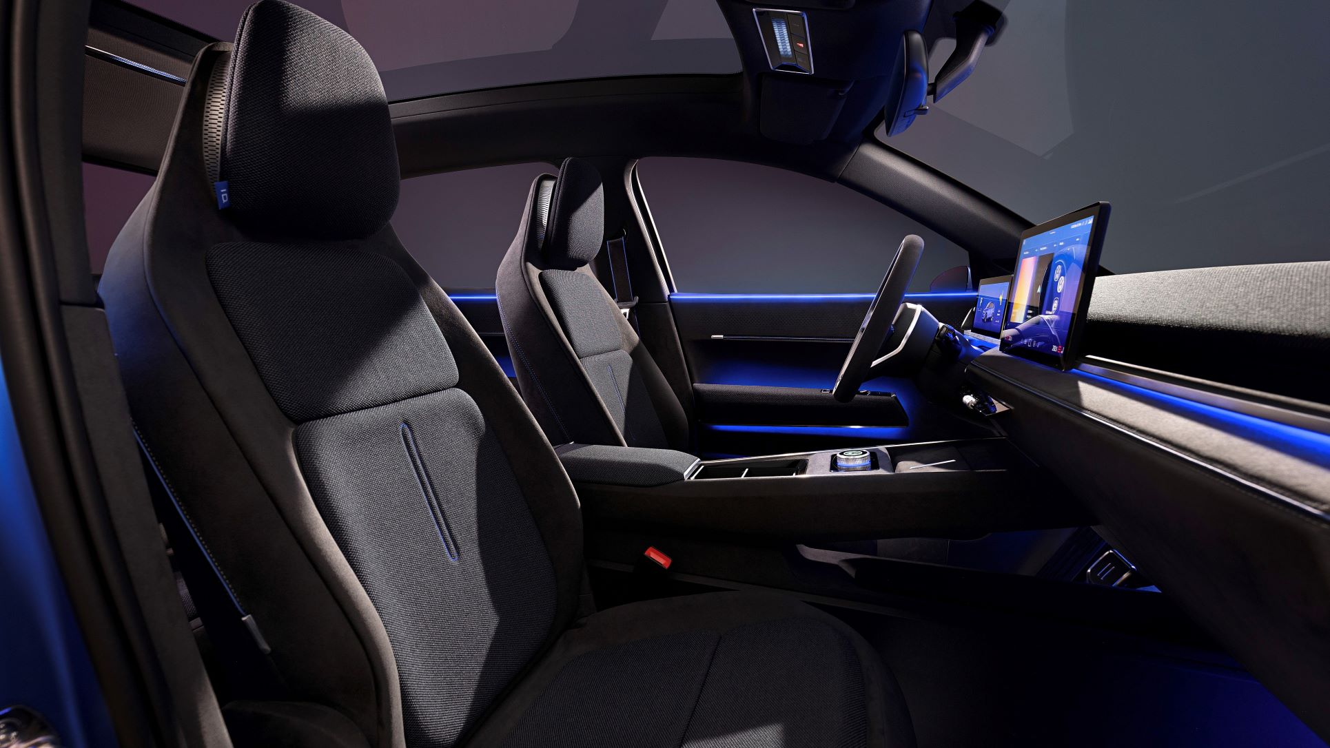 The new multifunction steering wheel is designed to be clear and self-explanatory, with two thumbwheels on the left and right and two buttons on either side. The driver of the concept vehicle is provided with all important information on one visual axis by the 10.9-in digital cockpit and head-up displays.