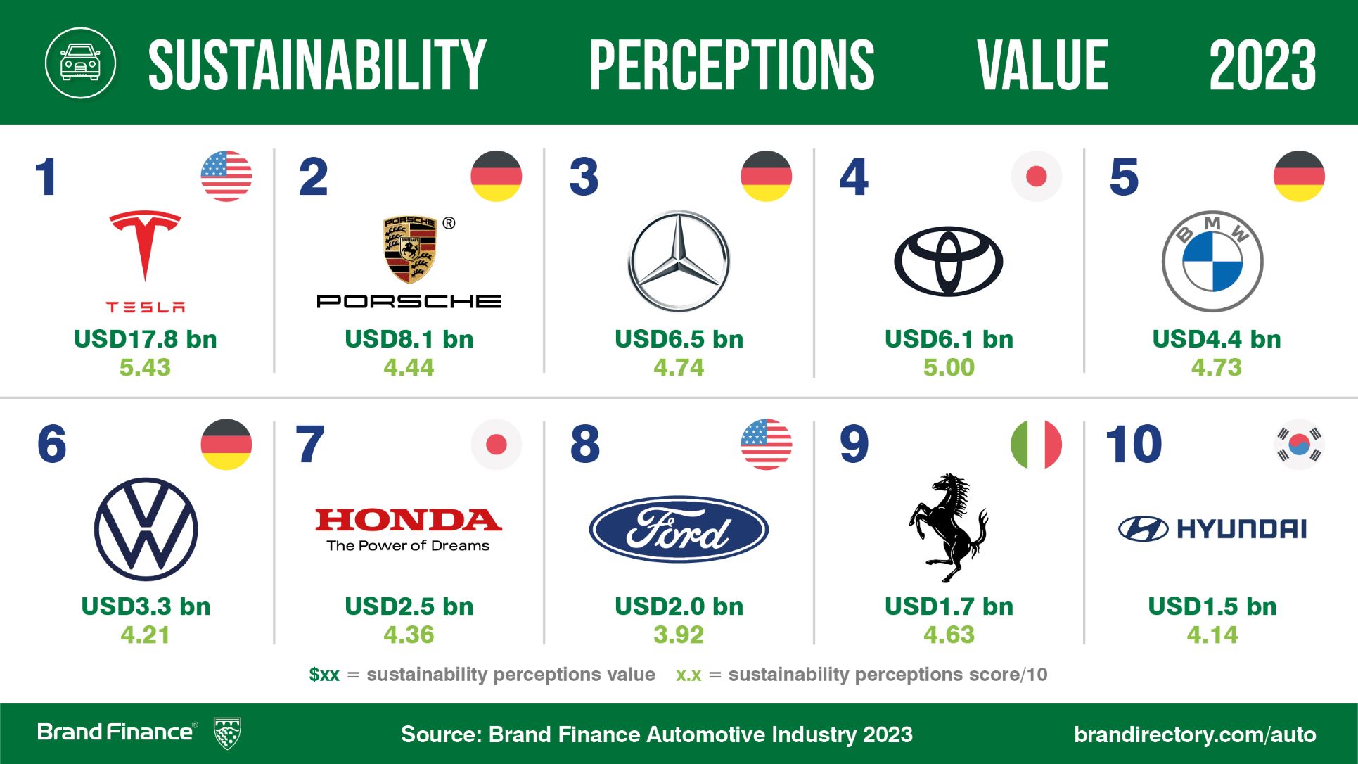 - Brand Finance’s Automobile Top 10 Sustainability Perceptions Value.