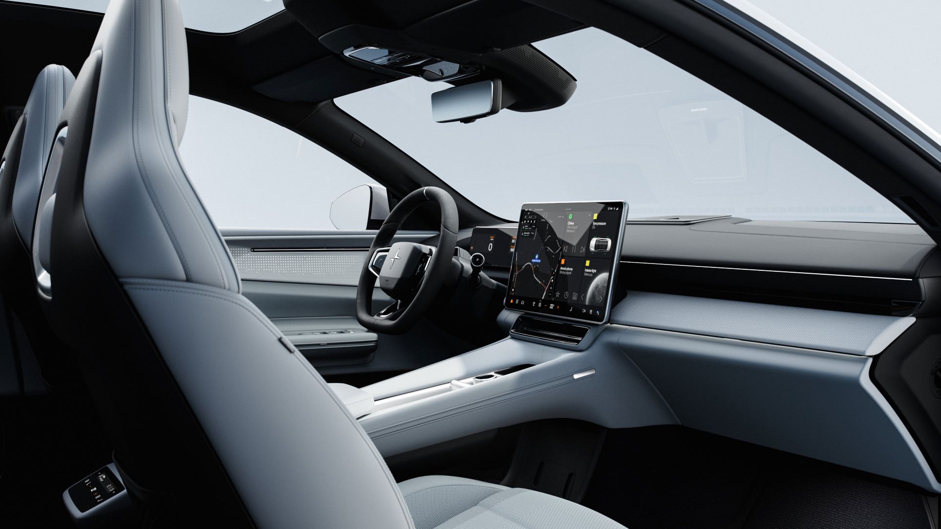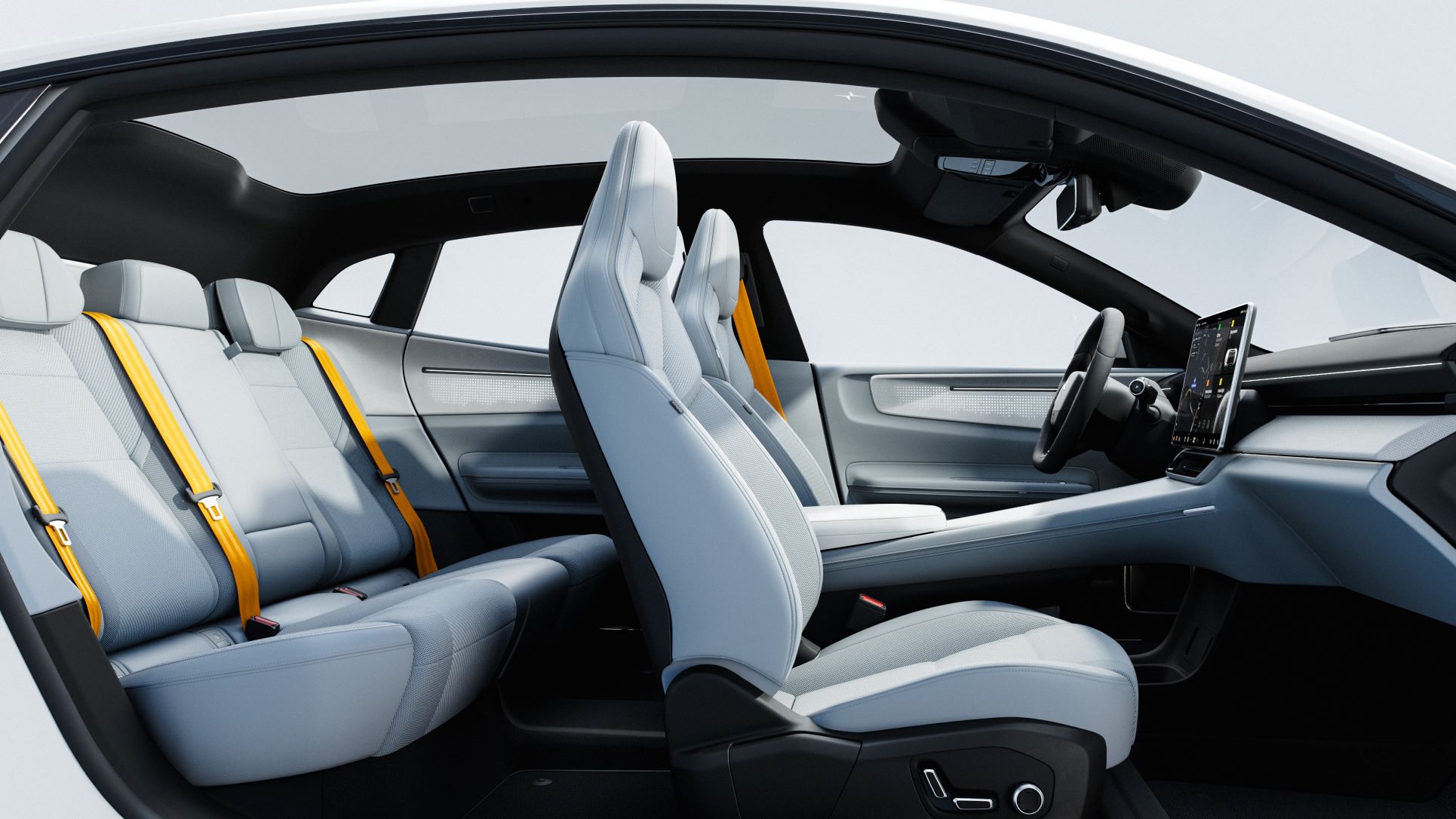 The interior and its materials are designed around a “soft tech” theme inspired by fashion and sportswear industries. A mono-material approach first presented in the 2022 Polestar electric roadster, is applied to interior materials, where all layers of certain components are produced from the same base material. This allows them to be recycled more effectively and efficiently by eliminating the need for incompatible material separation before recycling.