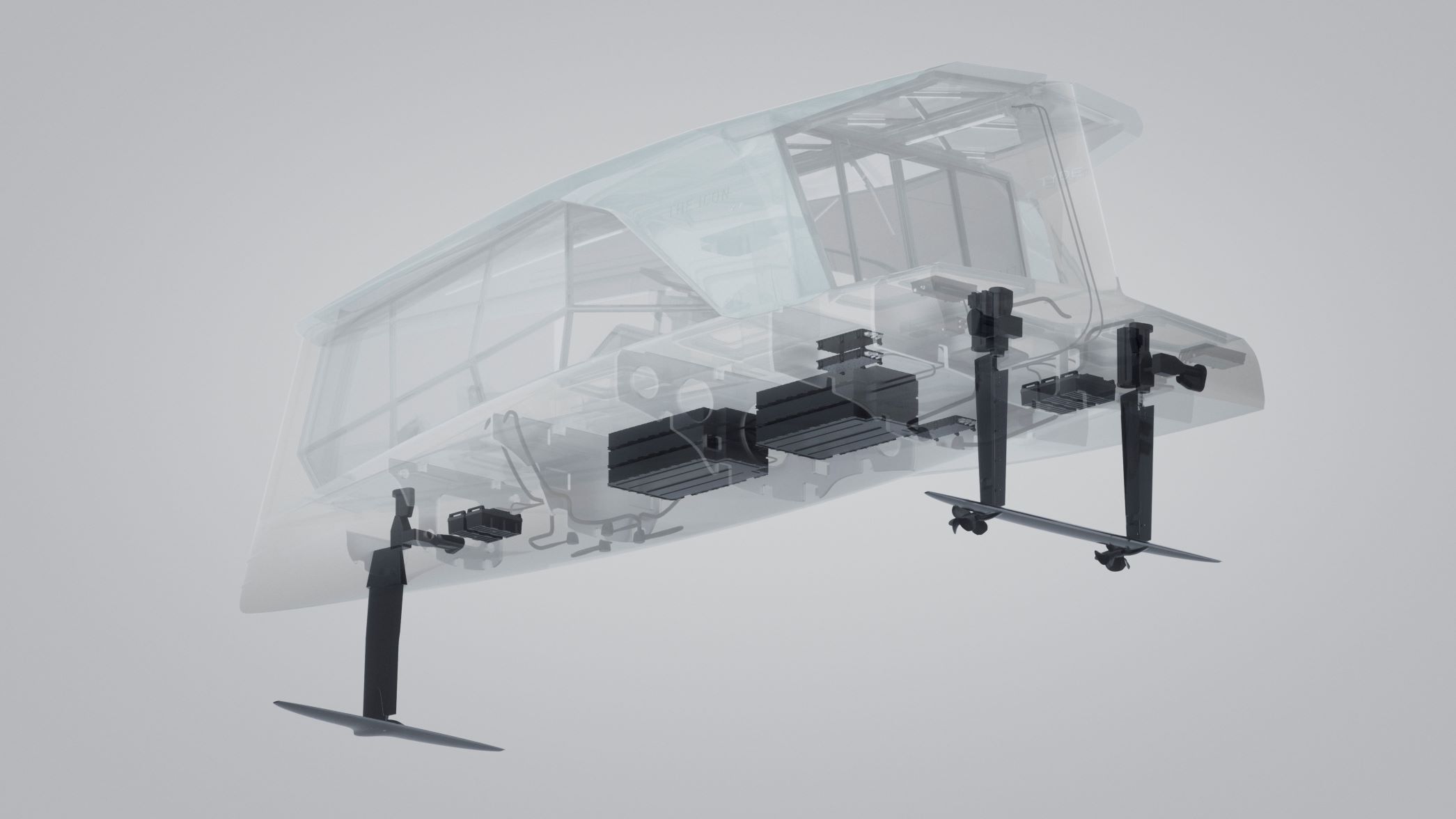 The Icon is 13.15 m (43.1 ft) long with a draft displacement of 1.87 m (6.1 ft) and draft foiling of 0.85 m (2.8 ft). Its body is made up of a flat hull and a central support element for the transparent architecture with a prism-like form. The hull’s origami lightweight structure has a rear width of 4.5 m (14.8 ft) for a spacious entrance into the luxurious lounge.