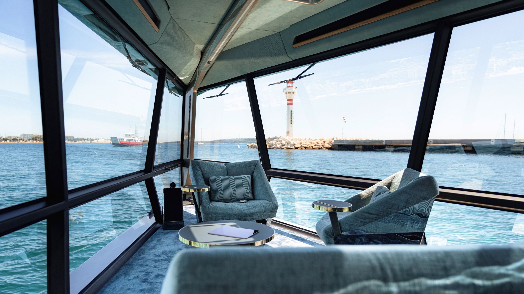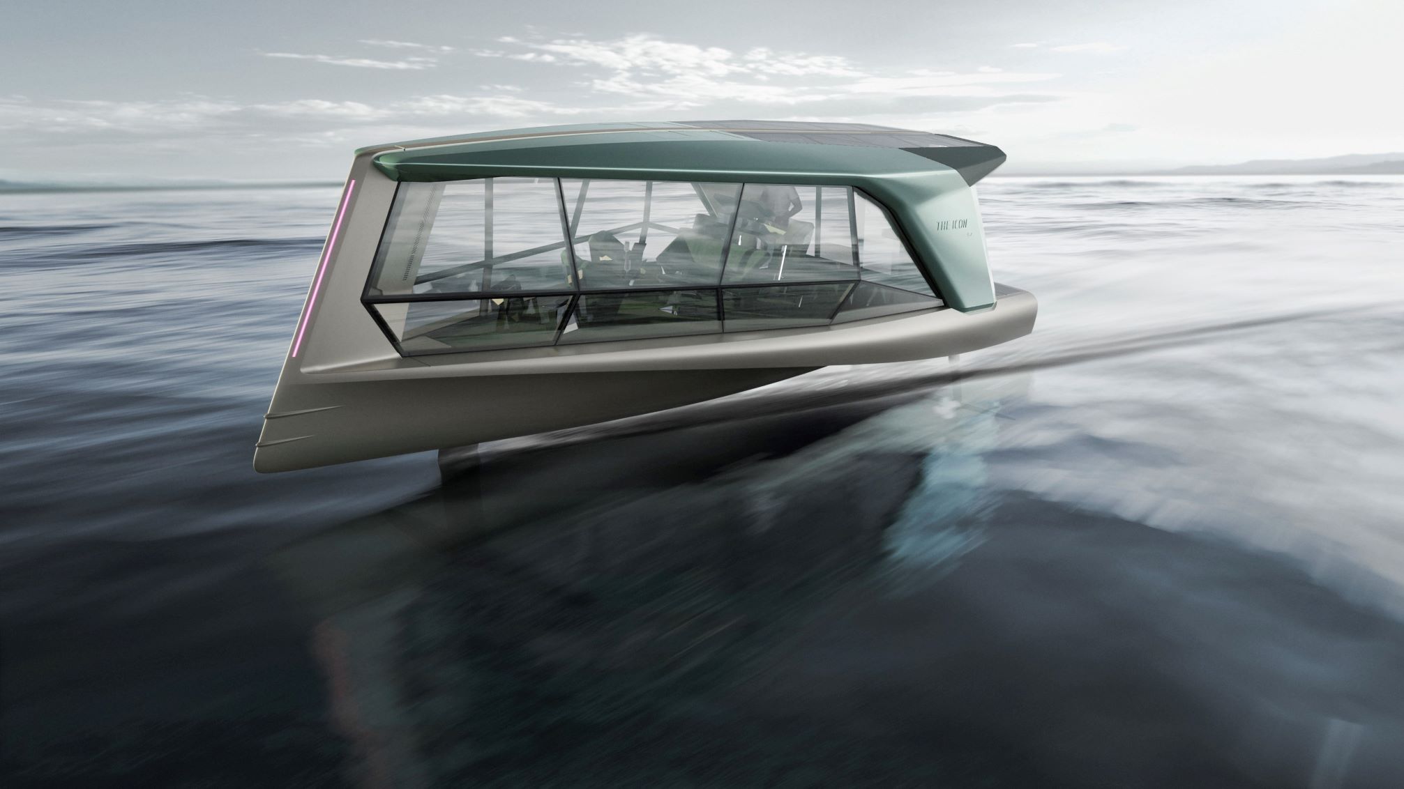 The designers replaced the conventional side sections of a watercraft with large glass surfaces, enabling passengers to enjoy the view while they glide above the water. Another key highlight is the use of modern LED light strips on the bow, stern, and charging connection points.
