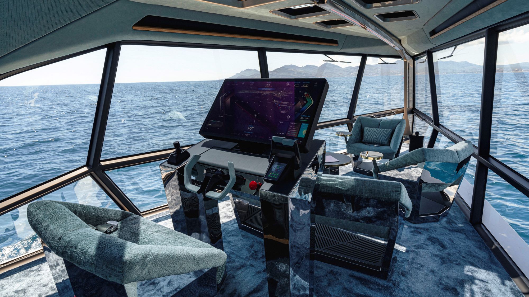 The command station is located centrally on the deck. Taking the place of the traditional nautical-instrument array is a fresh interpretation using a digital control unit. The human-machine interface is a 32-in touchscreen display with 6k resolution and the look and feel of a BMW iDrive control. Teamed with the automaker’s Operating System 8, key functions such as range information and weather reports can be called up using voice commands.