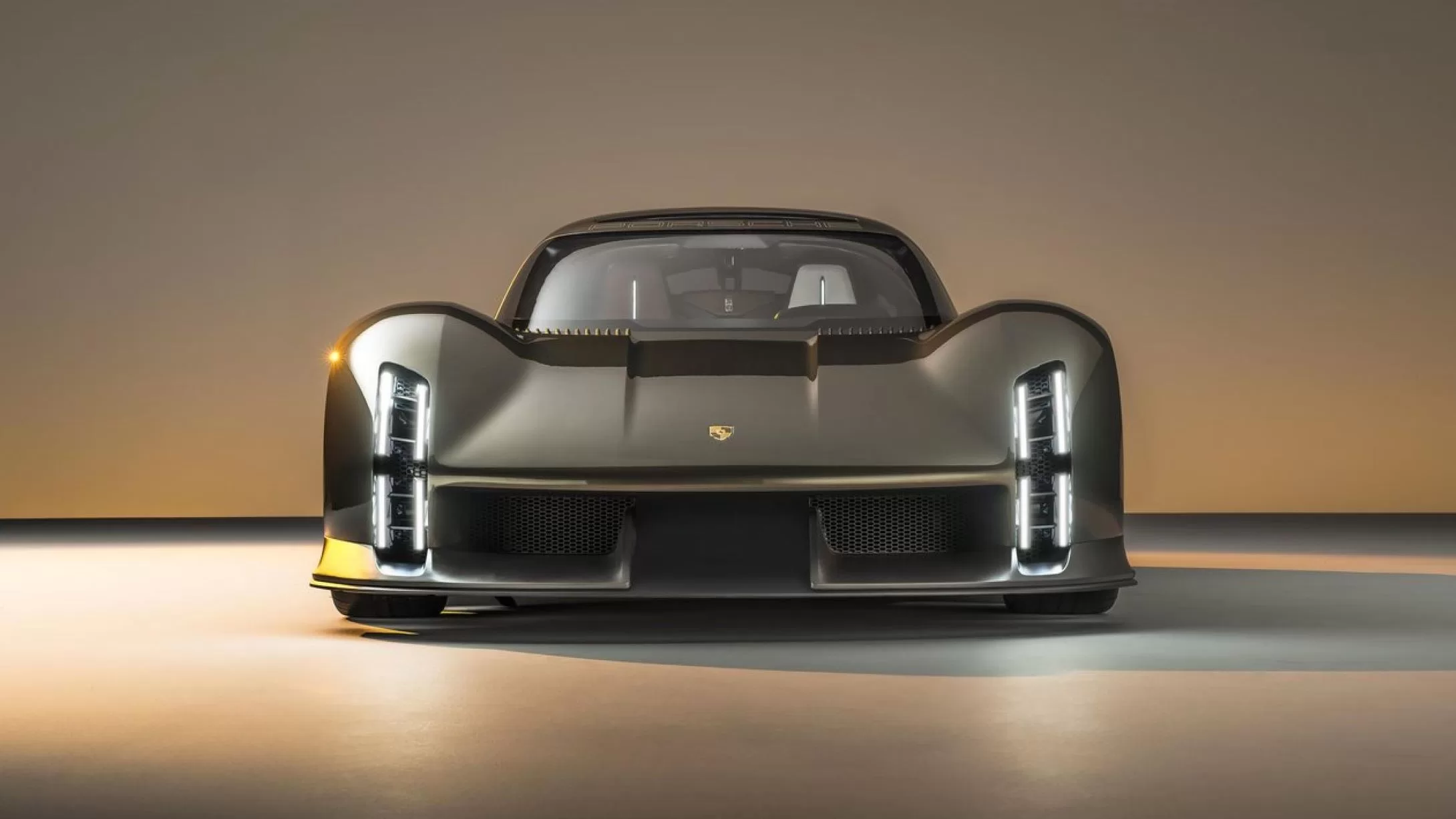 In the rear is a full-length light that appears to float and transparent, illuminated Porsche lettering. While charging, the “e” of the “PORSCHE” lettering pulsates. The four segments of the sculptural rear light are suspended from intricate support structures. The Mission X debuts a modernized Porsche crest on the hood, steering wheel, and wheels of brushed precious metal, a three-dimensional honeycomb structure, a refreshed heraldic beast, and a more subtle gold color.