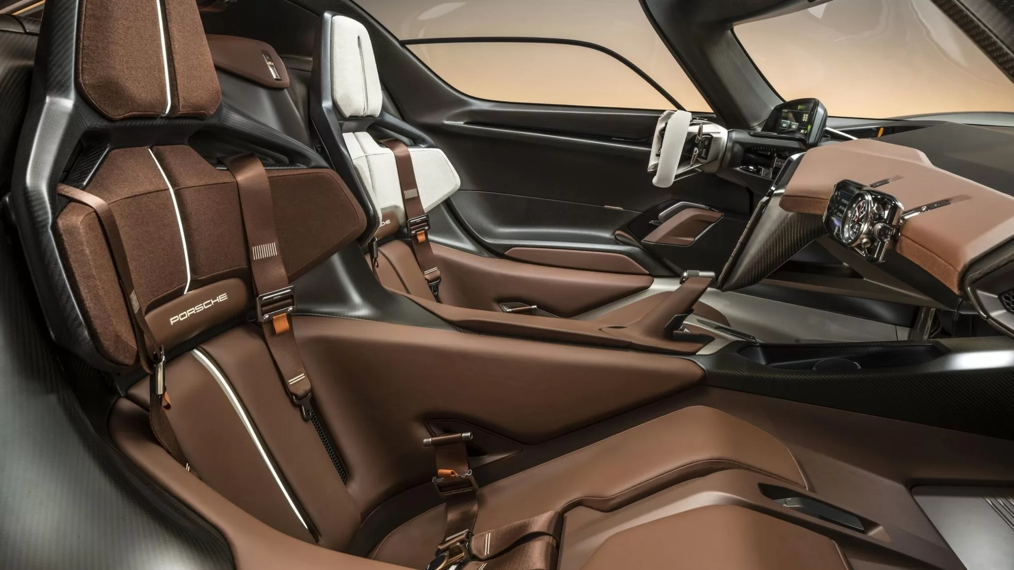 Inside, a focus on the driver translates to asymmetry in design and color. Andaluz Brown is the predominant interior color with touches of Kalahari Grey on the driver’s seat and steering wheel. Motorsport influences are seen in the CFRP seat shells, their six-point seatbelts, and open-top steering wheel with mode switches and shift paddles. The seats can be customized with 3D-printed body forms.