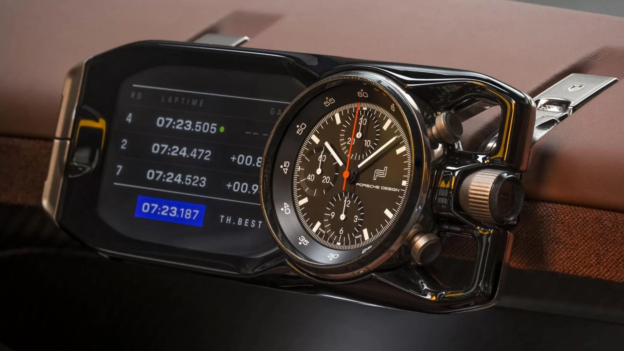 On the passenger side is a bayonet system in the instrument panel with which a stopwatch module can be attached. Porsche Design created a special stopwatch module with analog and digital displays for both the racetrack and rally use for the display of lap times and other vital data.