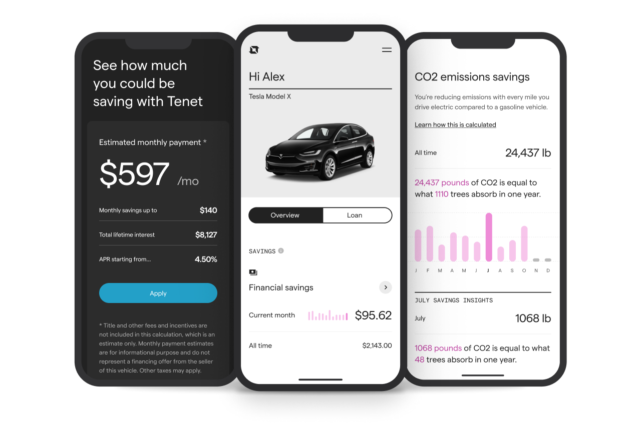 Tenet is focused on ushering in a new era that puts carbon-free emissions within reach for almost every new car buyer. Its financing is designed to save customers hundreds of dollars every month, track carbon emission savings and vehicle performance, and help achieve sustainability goals.