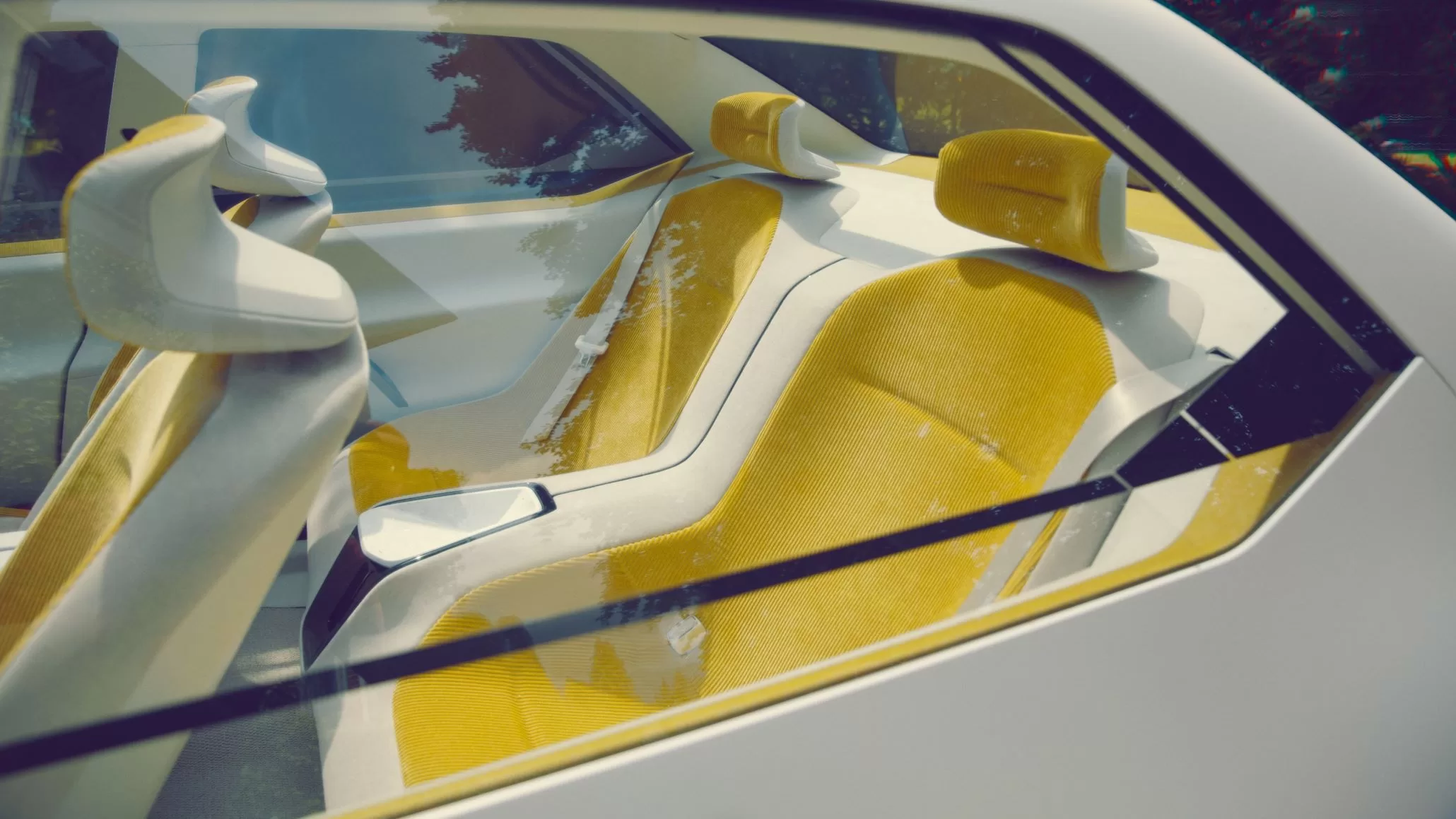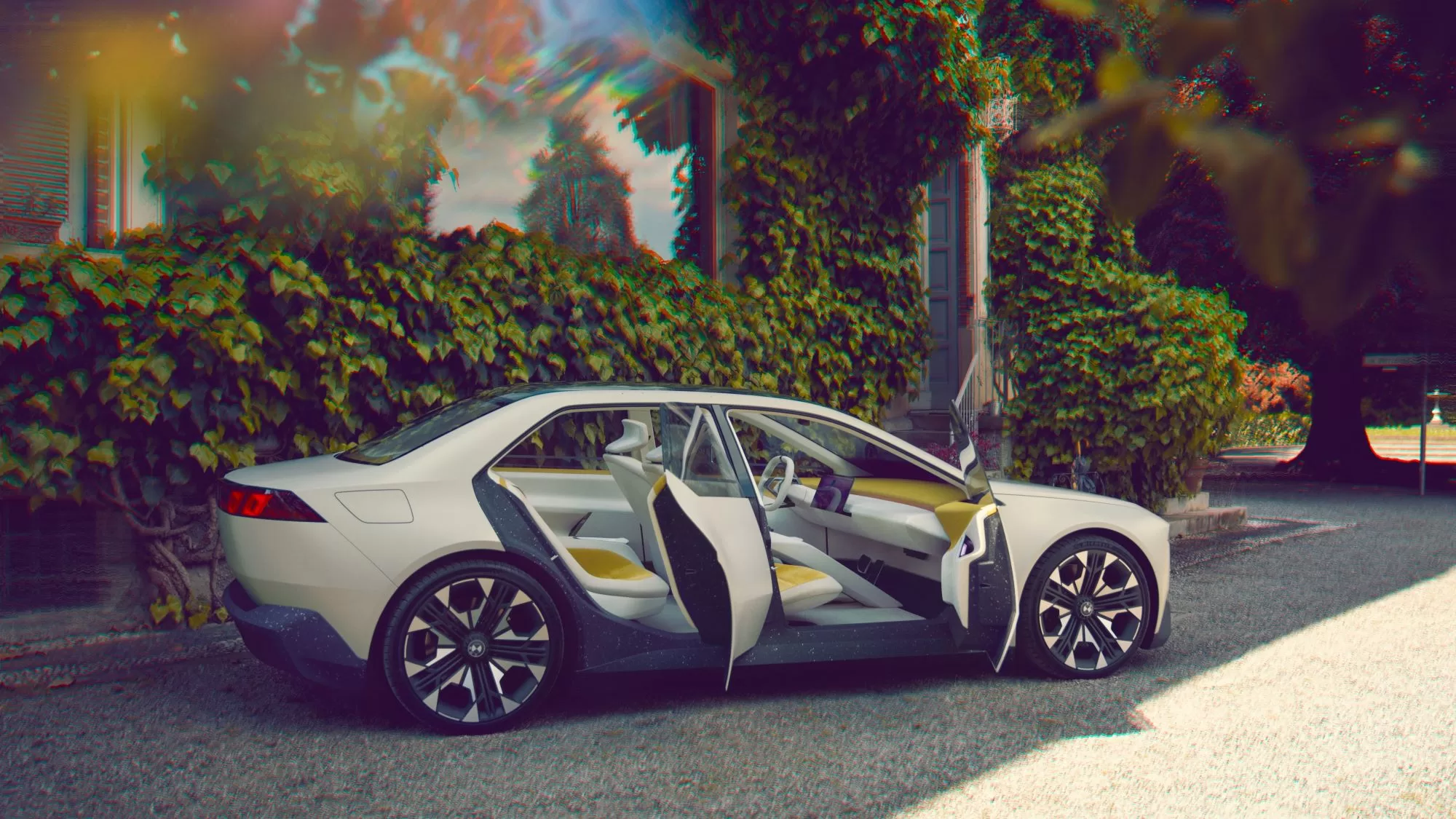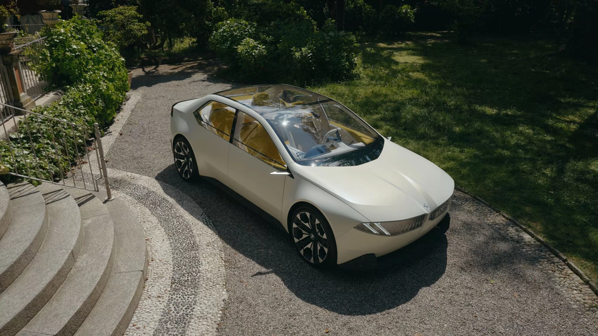 The “almost monolithic” vehicle body, with strong indentations at the front and rear, and large window areas, create a new BMW aesthetic. The powerful wheel arches, “retracted greenhouse,” and steeply forward-slanting “shark nose” front end are all characteristic BMW features. The exterior’s “Joyous Bright” subtle yellow hue contrasts with close-to-black side skirts and lower bumpers. The 21-inch aerodynamic wheels have a classic cross-spoke design inspired by motorsports.