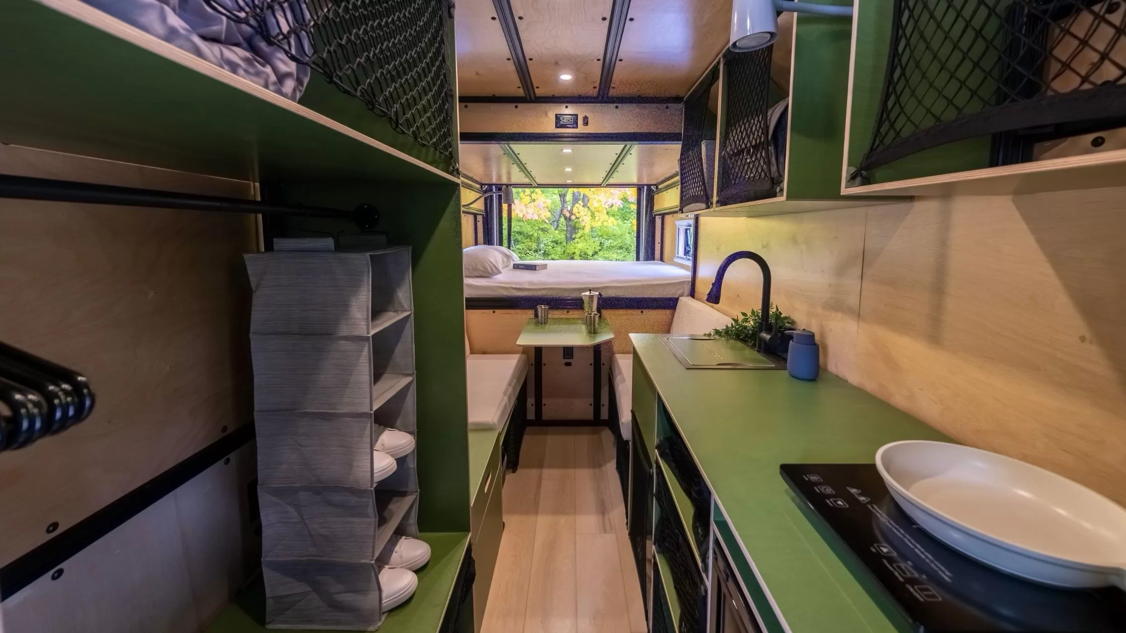 “To design the interior, we drew inspiration from contemporary Nordic outdoor gear,” said Shapiro. “Optional components include a spacious queen bed, seating for up to 7, a large pull-out table for work or dining, and a well-equipped kitchen for the adventurous chef.”