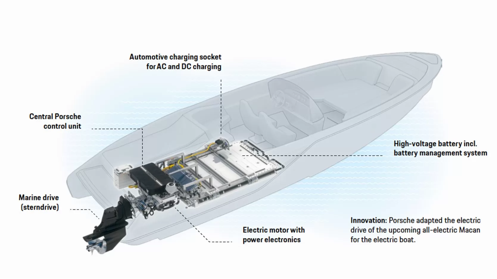Working with Frauscher, Porsche adapted and further developed its drive technology designed for road vehicles for use on the water. The 850 Fantom Air e-boat uses components from Macan’s Premium Platform Electric (PPE) architecture. This includes a permanently excited synchronous electric motor (PSM), with a limited peak power of 400 kW for use in the eFantom, and the associated power electronics. A shaft transmits the power from the rear-mounted electric motor to the marine Z-drive.