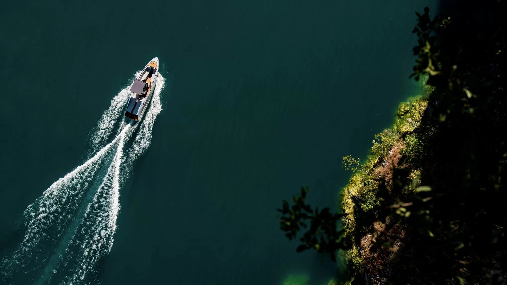- Frauscher x Porsche 850 Fantom Air near shore.
