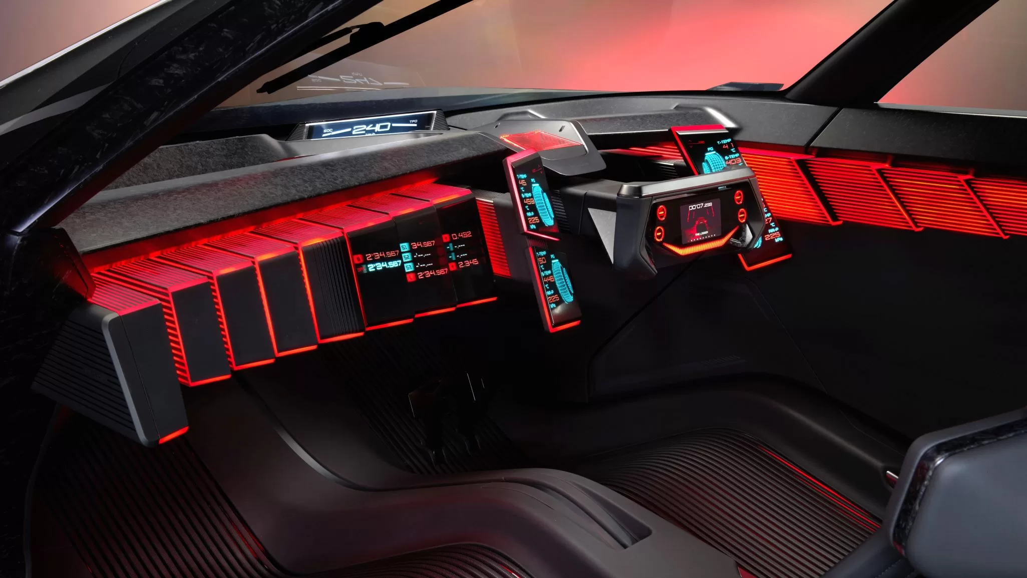 In R mode, the cabin illuminates in red and creates a cockpit centered around the driver to support concentration. Panels on the dashboard extend toward the seating space to enhance the cockpit feel around the driver. Meanwhile, four satellite screens around the steering wheel display tire grip and temperature, air pressure, brake rotor temperature, power distribution, and other information for racing.