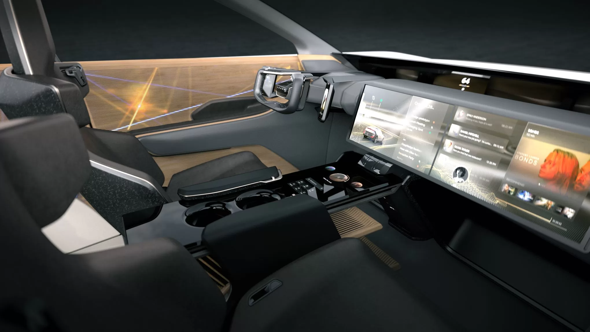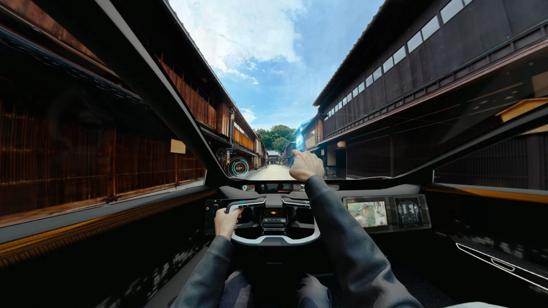 The expansive monitor on the front passenger side functions as a highly programmable open platform for entertainment and other applications, broadening the prospects for future mobility.