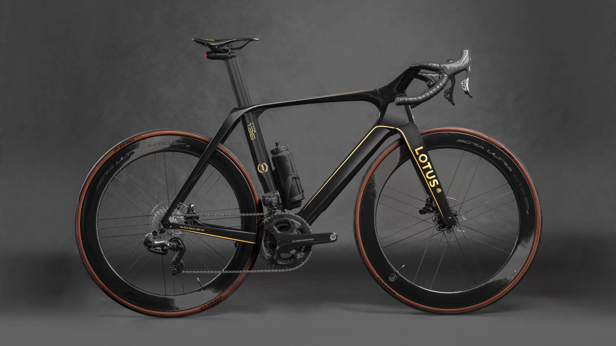 The Type 136 will be available as an exclusive limited First Edition launch production run of just 136 bikes with pricing of £20,000 (€25,000). These will be individually numbered and available in an iconic “Black Gold” Lotus motorsport livery. With full Campagnolo Super Record wireless groupset and Campagnolo Bora Ultra WTO 60 wheelset.