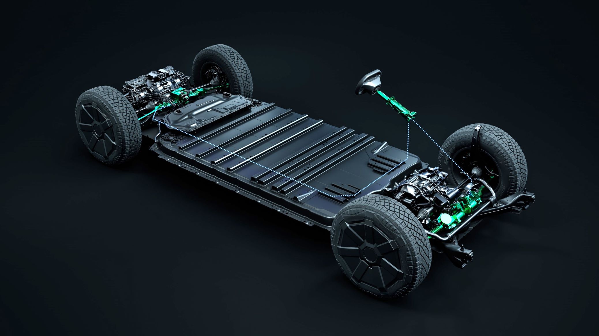 Four-corner electronically adaptive air suspension offers 12 in (305 mm) of travel and up to 17.44 in (443 mm) of flat-floor ground clearance in Extract Mode. The 20-in wheels shown at the event are fitted with 35-in all-terrain tires.