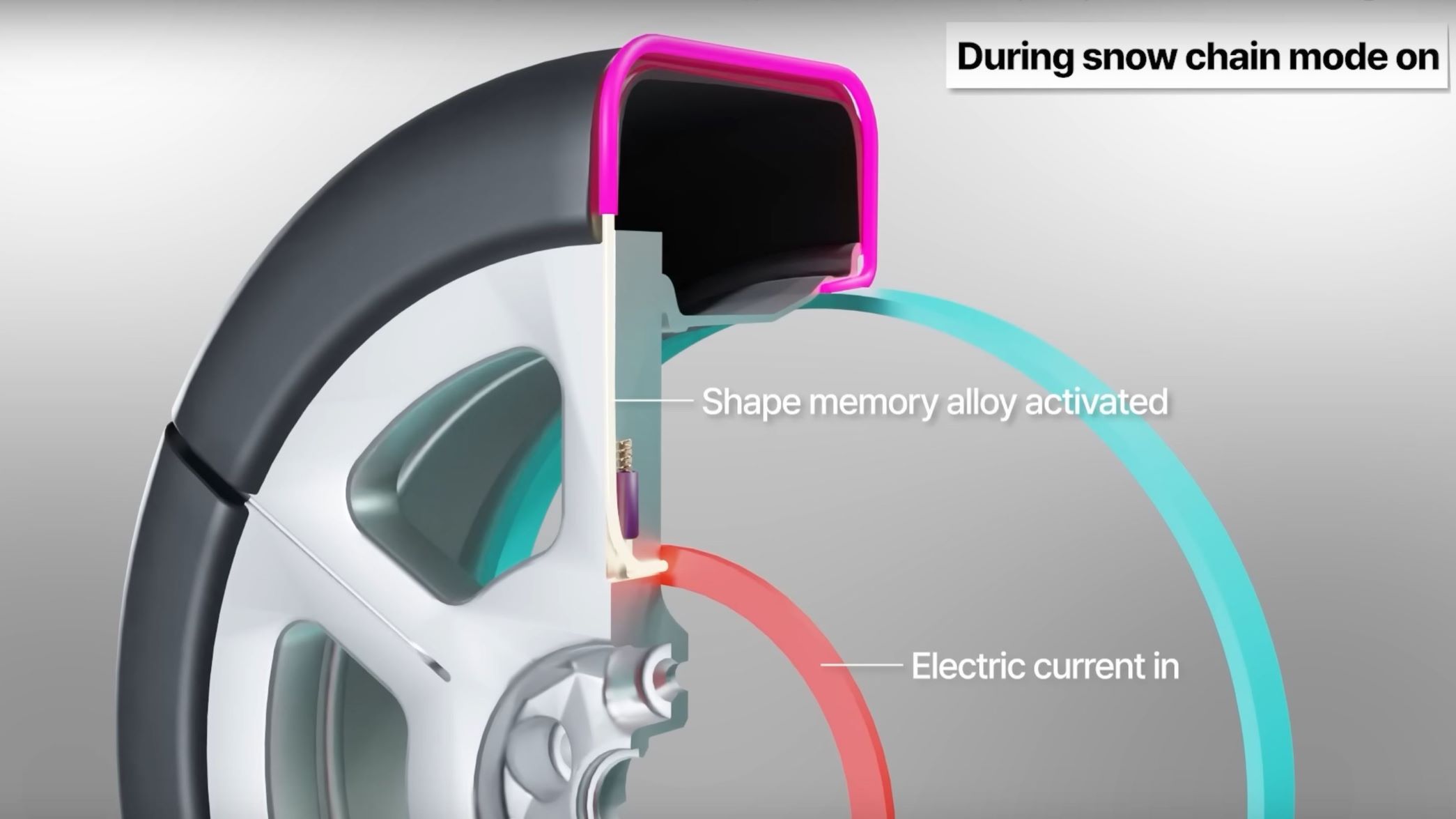 The second new technology is a new snow chain-integrated tire system for winter driving conditions. It uses shape memory alloy inside a wheel and tire to act as a snow chain at the touch of a button.