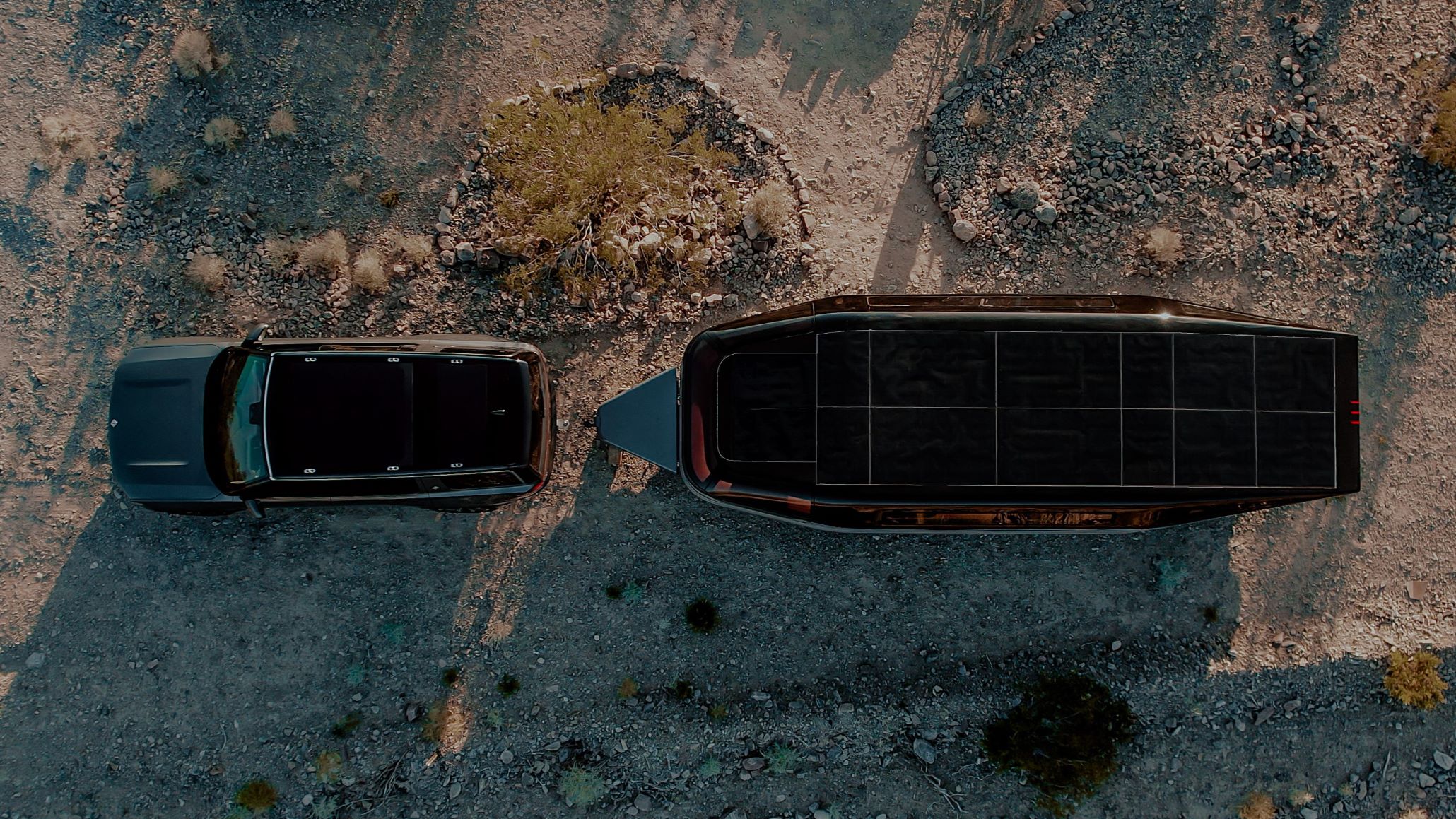 - Lightship L1 with Rivian R1S tow vehicle from above showing solar array.
