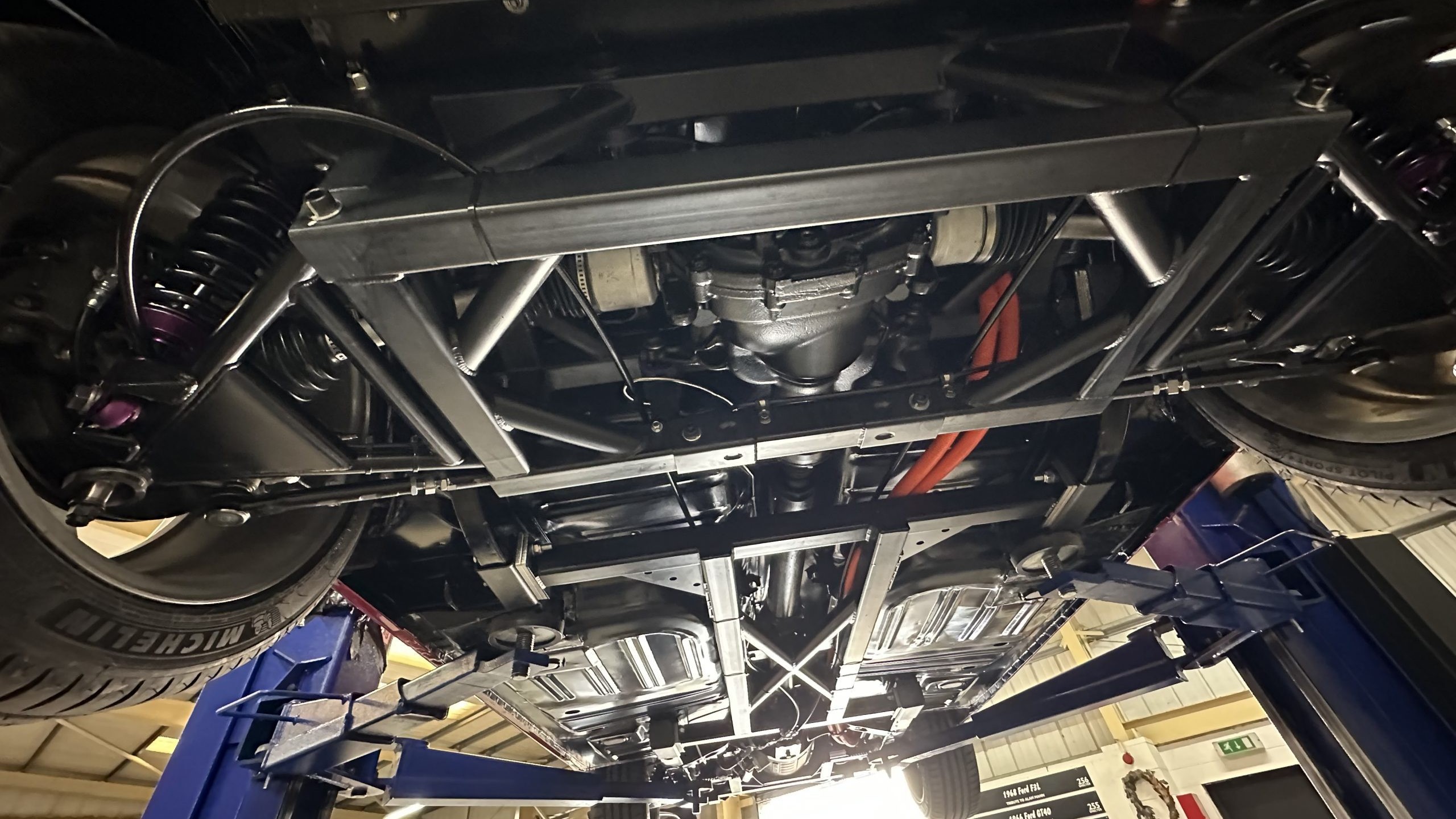 - Mann ePower Cars’ electrified first-gen Ford Mustang chassis bottom view.