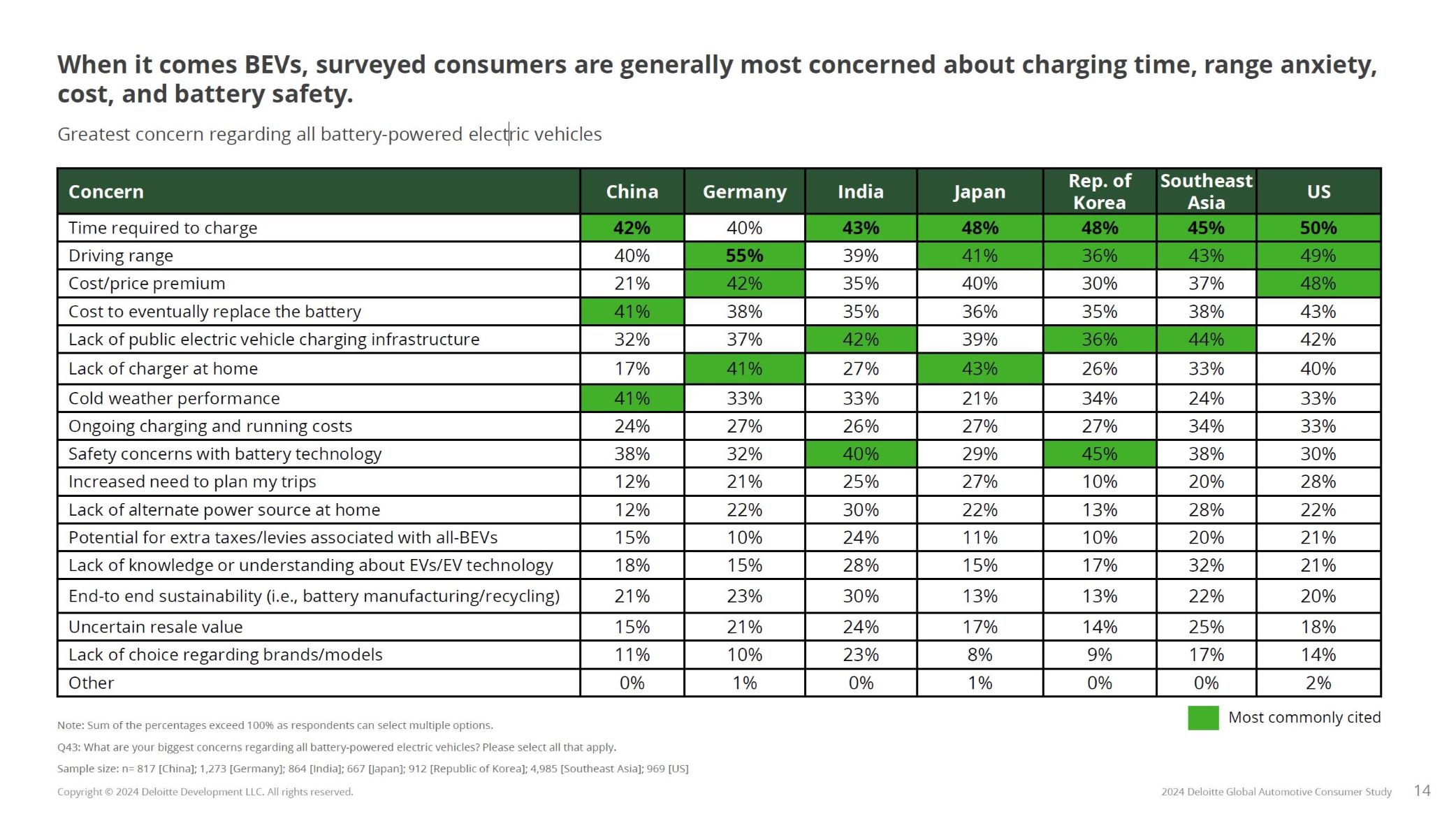 - Deloitte – For BEVs, consumers are generally most concerned about charging time, range anxiety, cost, and battery safety.
