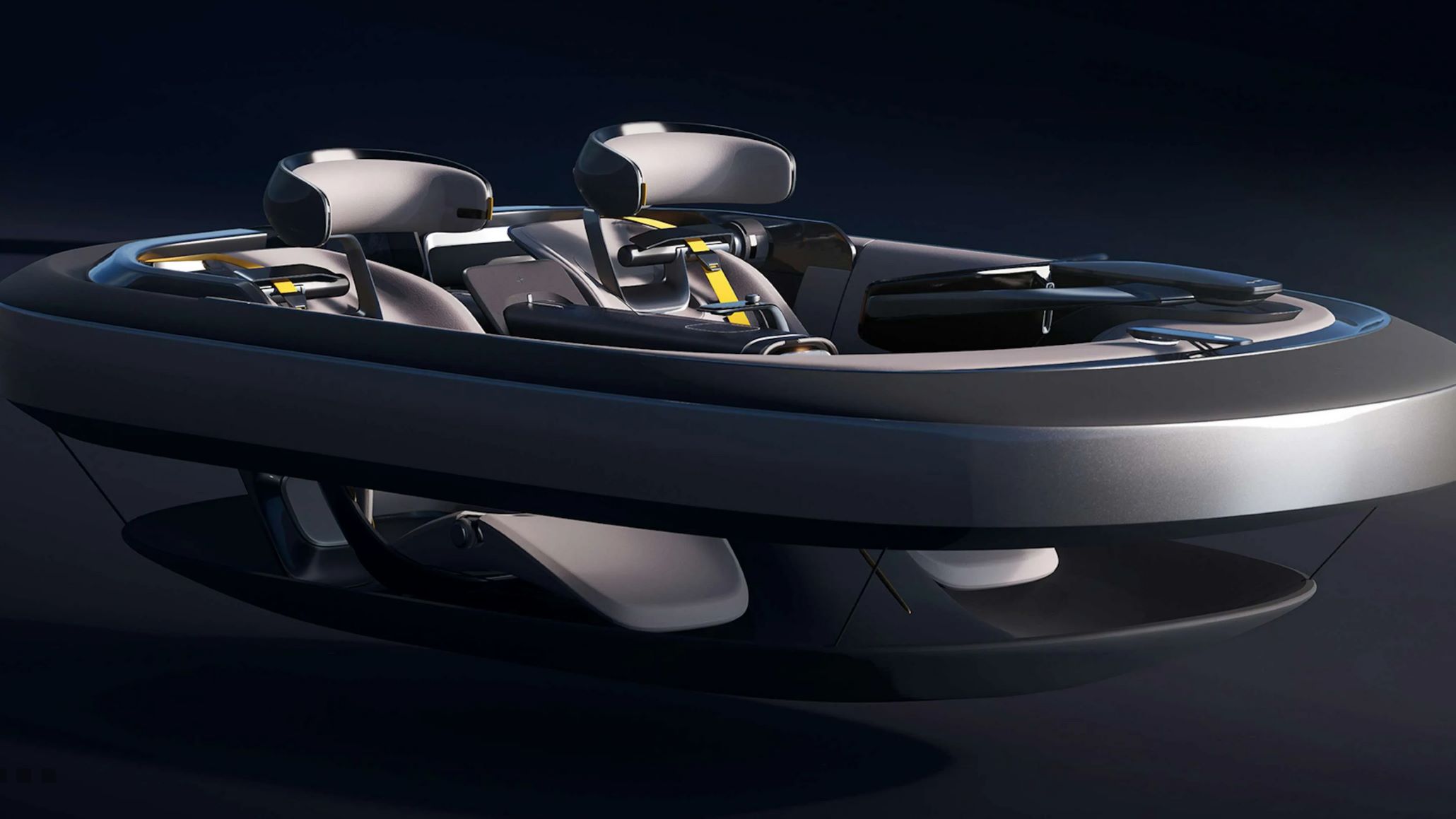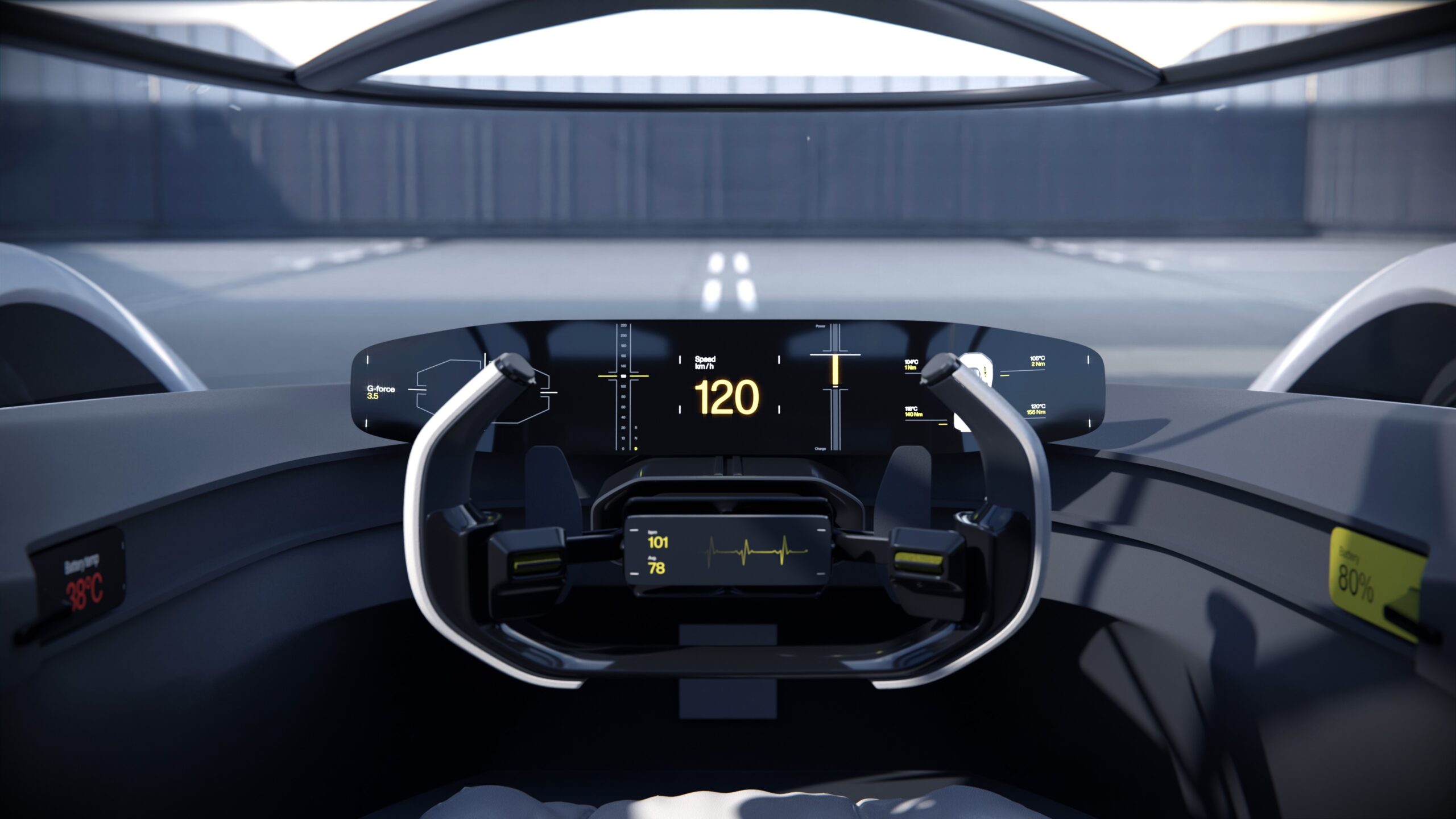 Interior designer Yingxiang Li provided a new type of performance experience of “floating, comfort, and control” in a two-seat interior featuring a single-hand control in place of a steering wheel with support from the car’s driving systems, just as a camera stabilizer enhances the control a user has over a camera. Gesture control is used when the car is stationary. The way the simple and calm forms sit within an inviting interior is further enhanced with bucket seats and a Swedish gold harness to hold the driver and passenger in place when driving at speed.