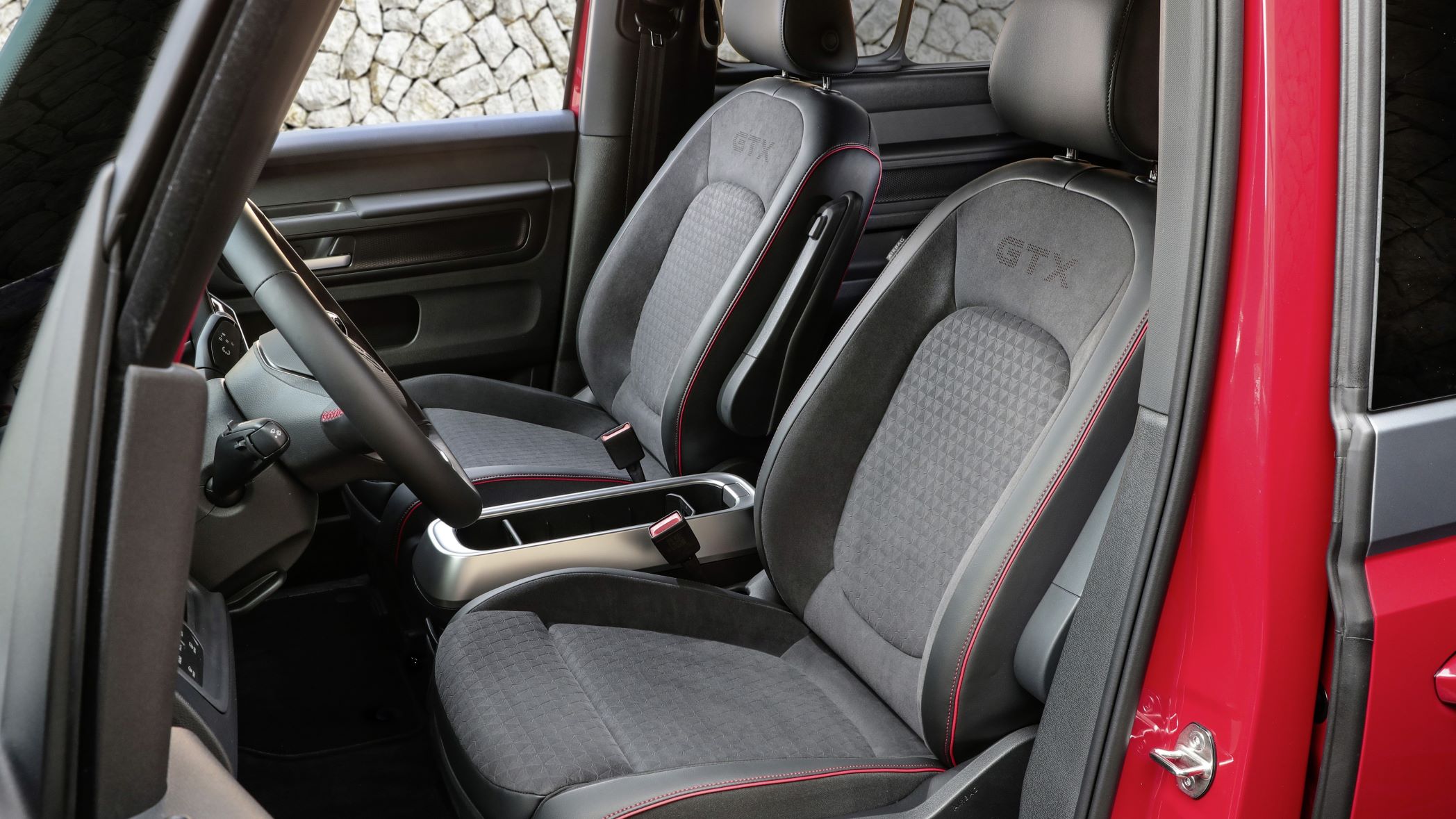 Inside, darker tones underline the sporty character, with GTX the only model in the line equipped with a black headliner. The seats feature a GTX-specific design, with covers of black ArtVelours Eco microfleece, a diamond pattern, and red piping/stitching.