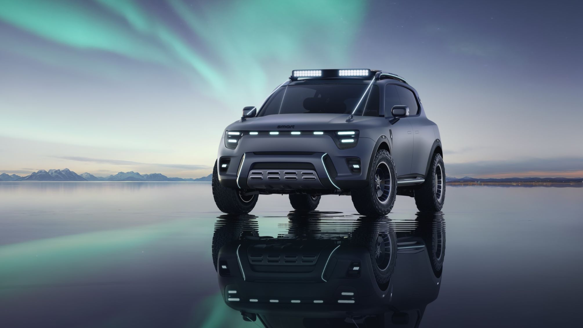 The mid-size SUV concept has an efficient footprint, with overhangs at the front and rear being exceptionally short. The concept features a boxy, upright silhouette and distinctive X roof structure with protective front and rear skid plates, a hidden integrated winch, a folding rear step for roof access, and a roof light bar. Light animations offer a playful yet sophisticated touch.