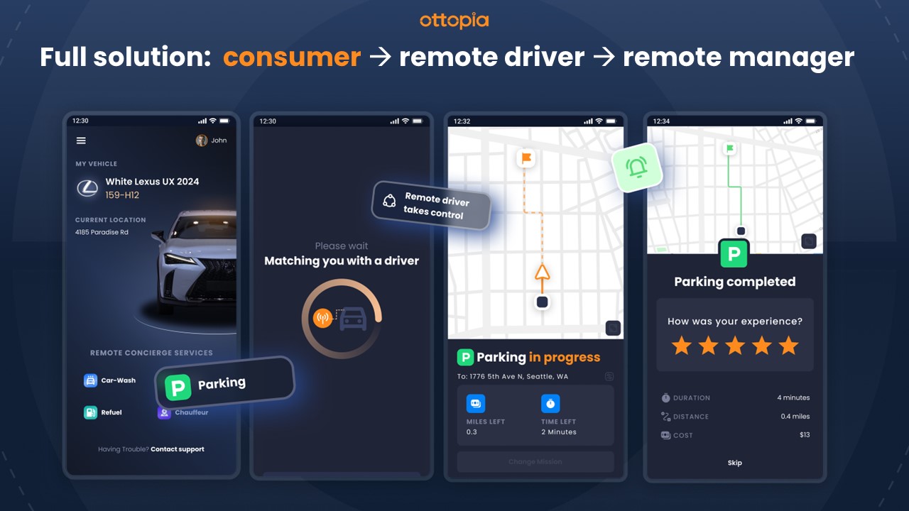 “Our mission is to transform the way people and goods are moving,” said Alex Kirshon, CTO of Ottopia. “Our first product is for enabling humans in a remote command and control center to act as your on-demand private driver for things like finding a parking spot, recharging and refueling, periodic check-ups and repairs, running errands, family drop-offs and pickups, and even driving you when you’re too tired or stressed to drive yourself.”