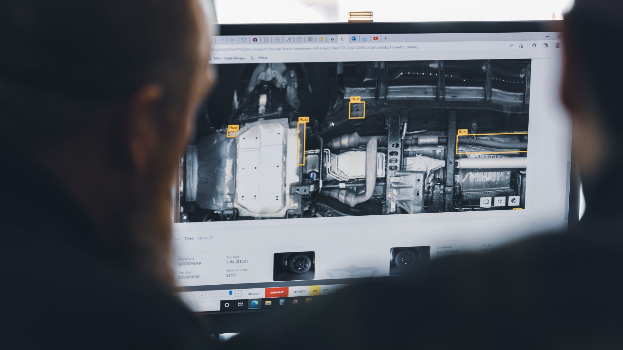 Some of the issues detected by UVeye include underbody diagnostics such as leaks, broken parts, or rust patterns; tire issues such as uneven wear patterns, sidewall damages, bulges/cuts in the rubber; and exterior issues such as scratches or dents.